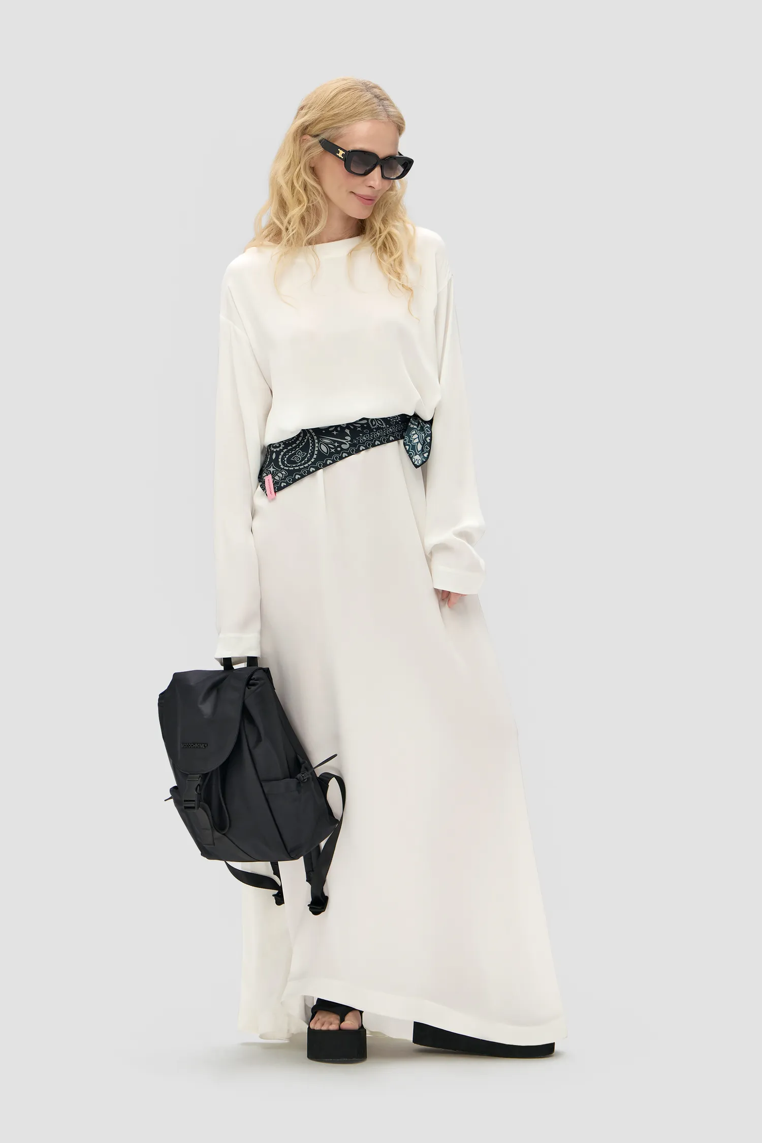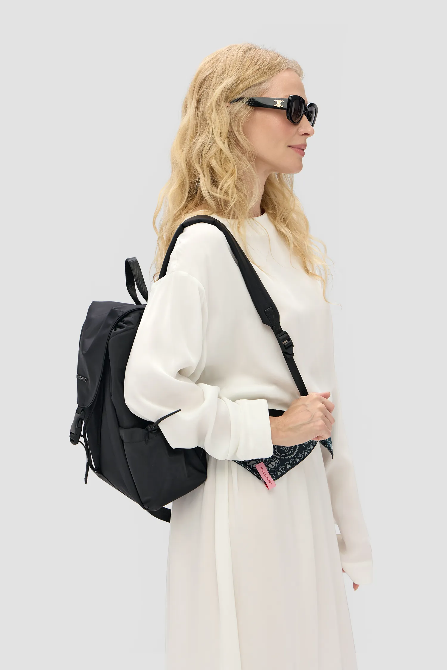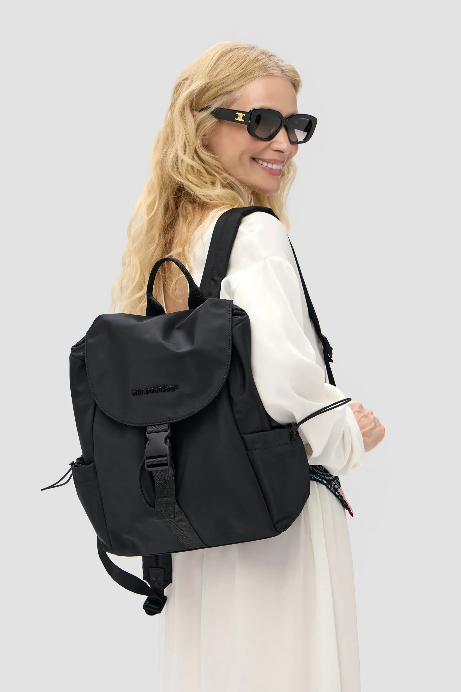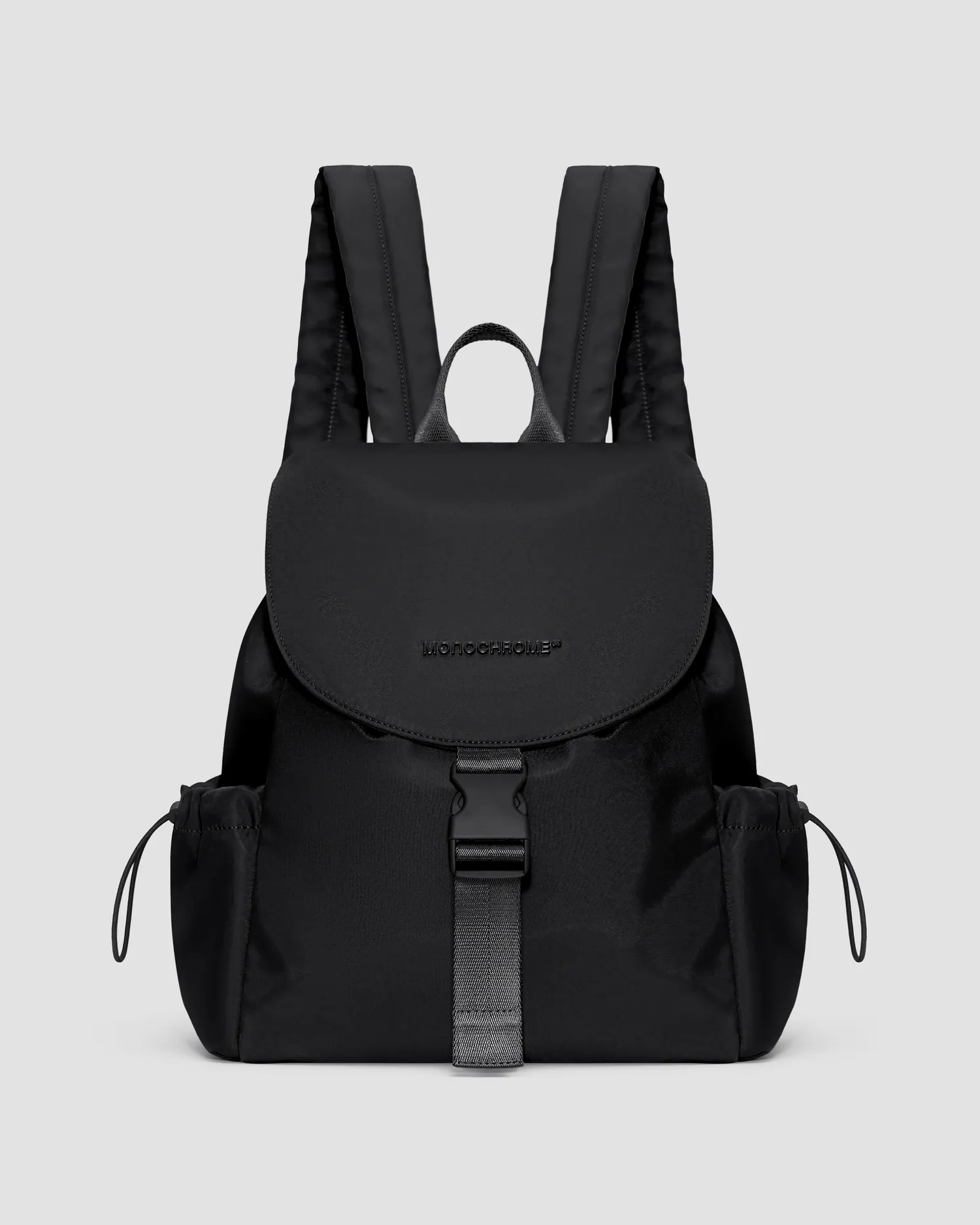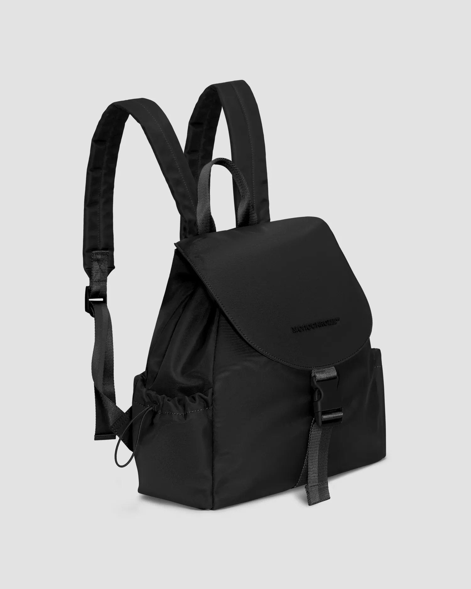 Нейлоновый рюкзак черного цвета с широкими лямками. Влагоотталкивающая пропитка. Откидной верх на застежке с покрытием софт-тач. Регулируемые плечевые лямки изделия. Рюкзак затягивается на плотный шнурок. Металлический логотип MONOCHROME в тон изделия. Два боковых кармана, регулируемые на кулиски. Кожаная нашивка с фирменным паттерном на внутренней стороне. Два отделения внутри. Внутренний карман на молнии с пуллером, выполненным в виде элемента фирменного паттерна MONOCHROME. Упаковка в розовый пыльник и подарочную коробку.