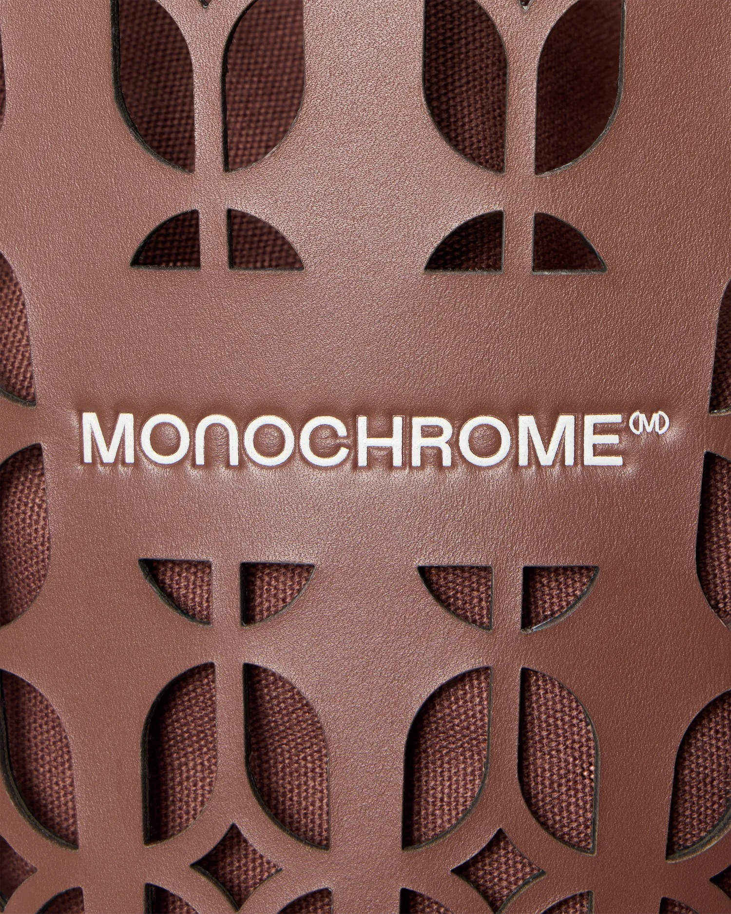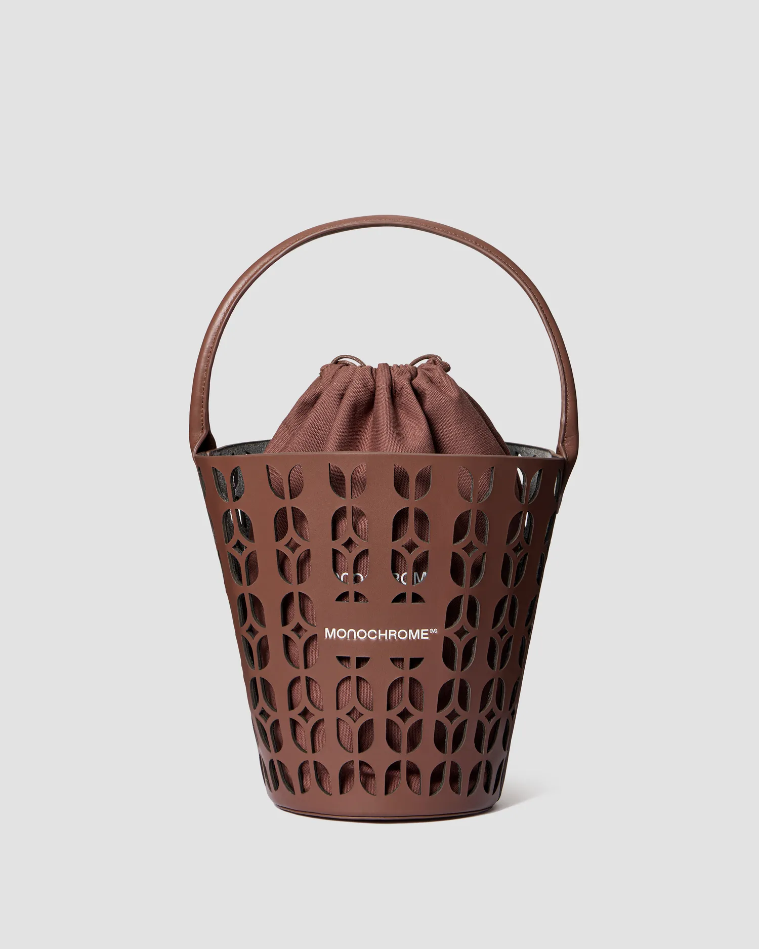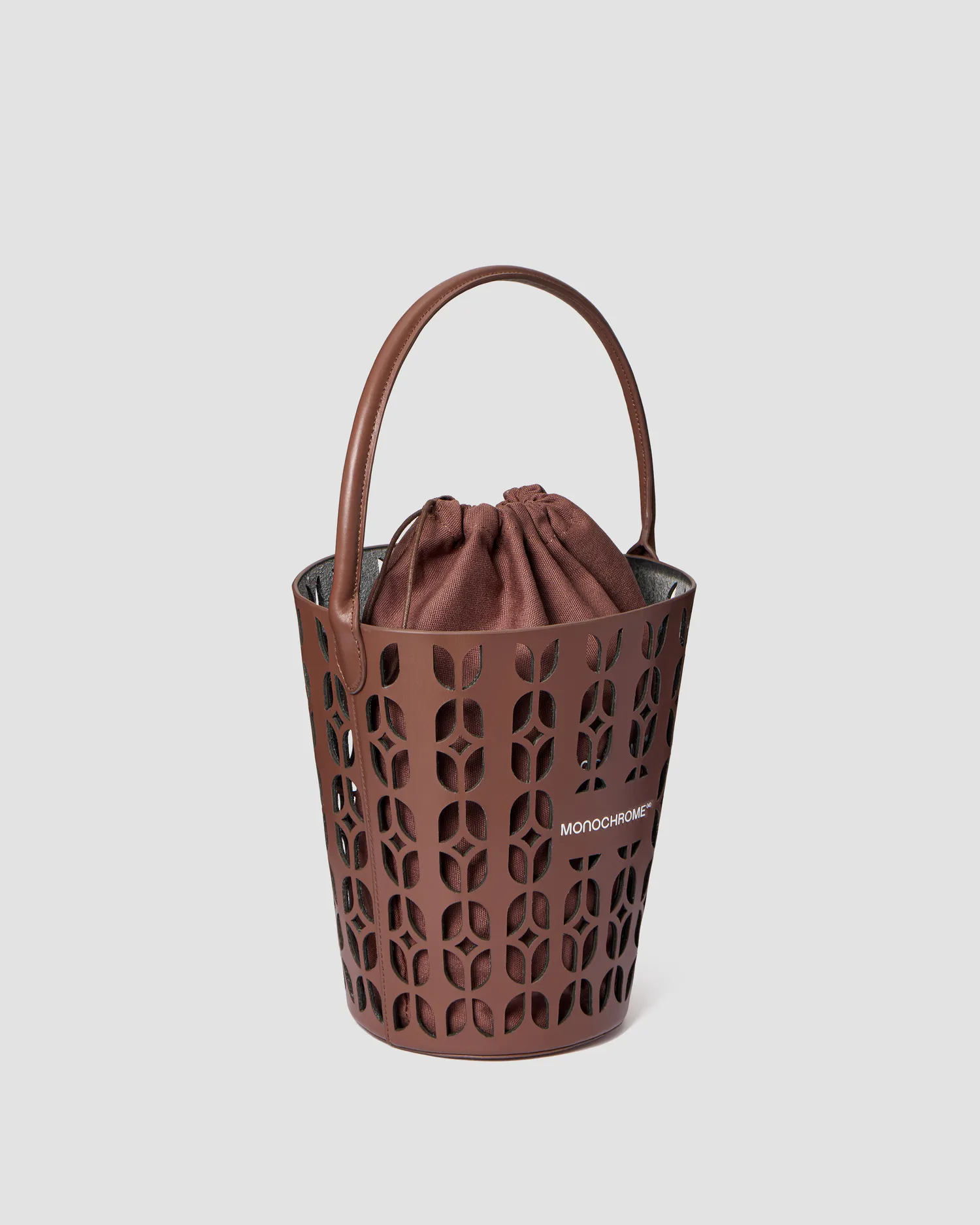 Сумка-корзинка из 100% натуральной кожи шоколадного цвета из коллекции VILLAGE'25. Перфорация в виде элементов фирменного паттерна MONOCHROME. Кожаная круглая ручка. Твердое дно сумки. Внутри мешочек из канваса на завязках, который можно убрать, и носить изделие без него. Тисненый логотип MONOCHROME белого цвета. Упаковка в специальную подарочную коробку.