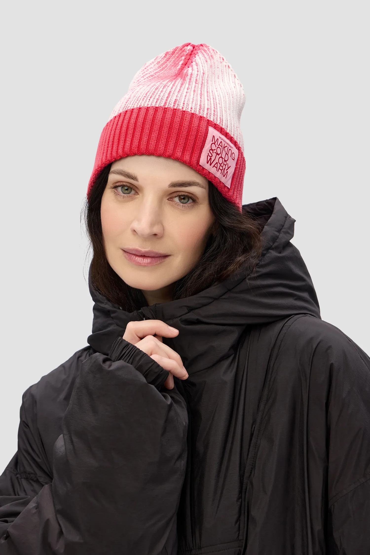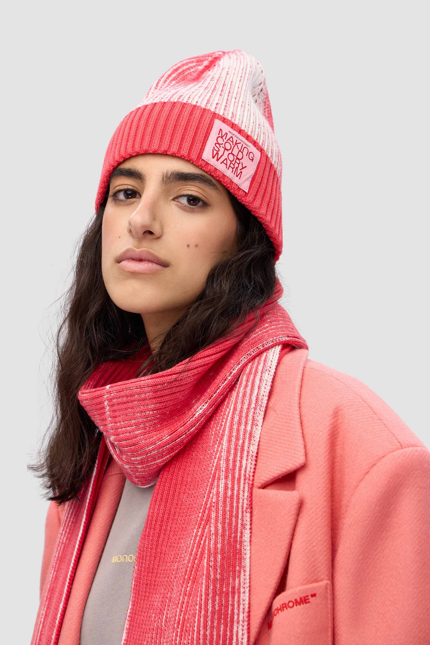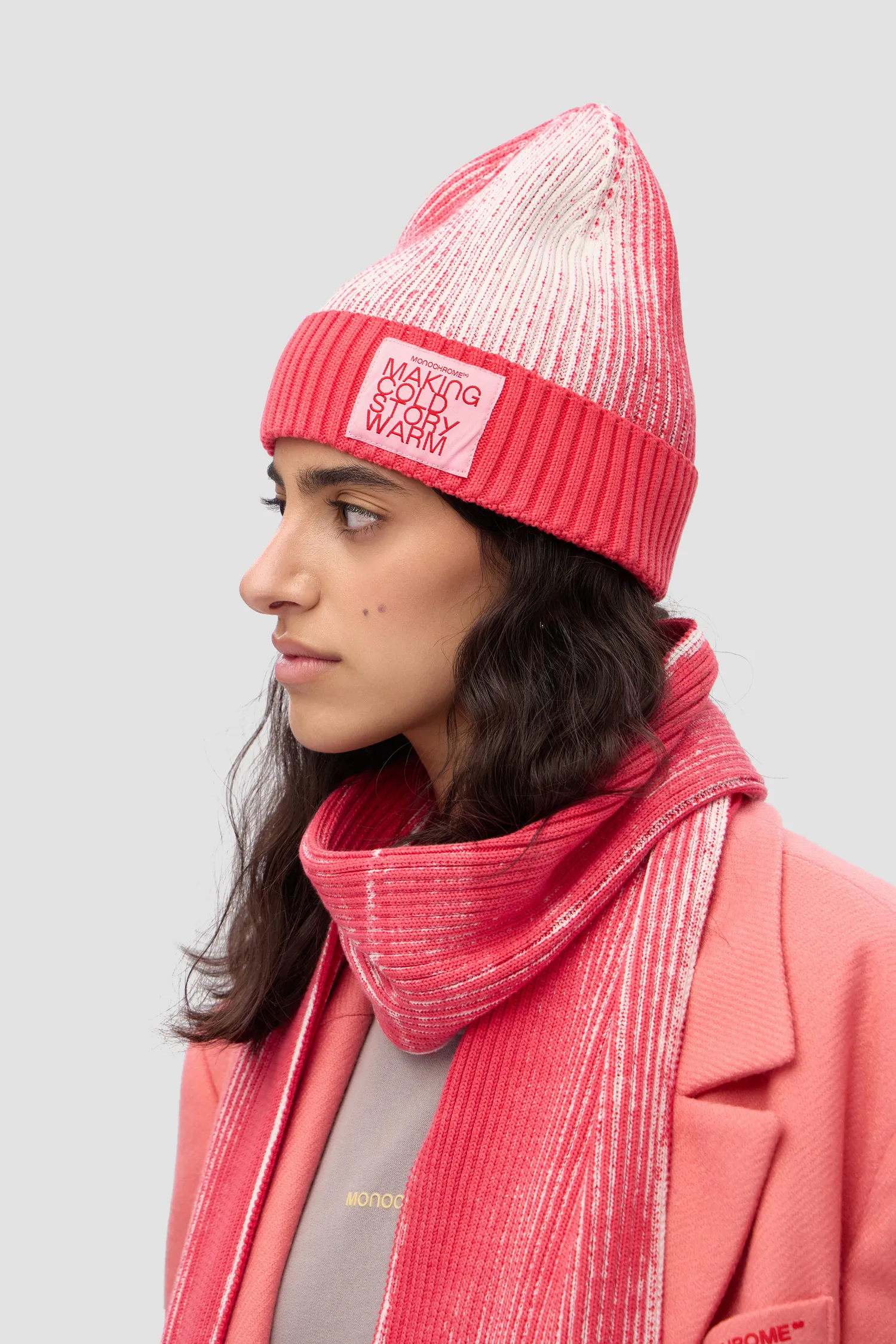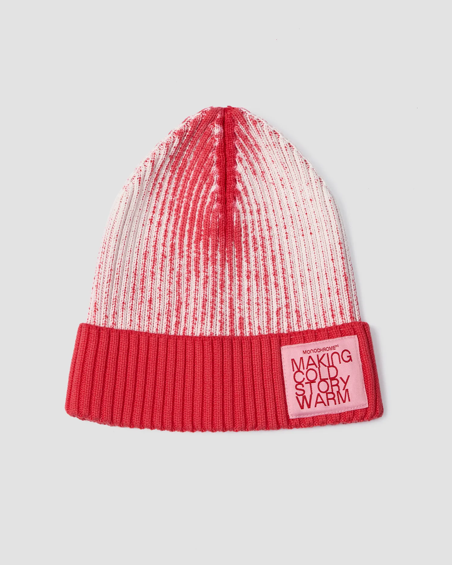 Вязаная шапка из 100% хлопка кораллового цвета, выкрашенная техникой garment dye. Нашивной жаккардовый лейбл на отвороте. Упаковка в базовую коробку.