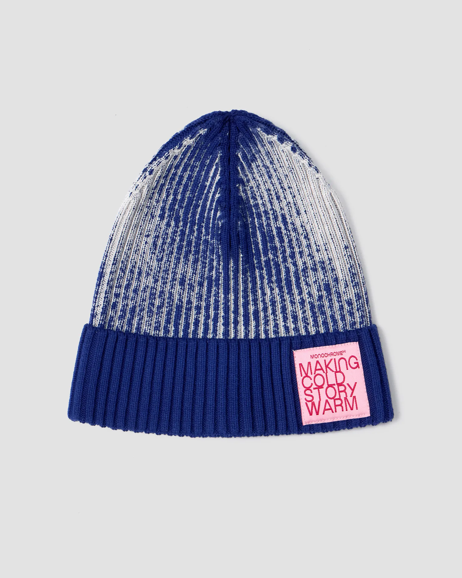 Вязаная шапка из 100% хлопка синего цвета, выкрашенная техникой garment dye. Нашивной жаккардовый лейбл на отвороте. Упаковка в базовую коробку.