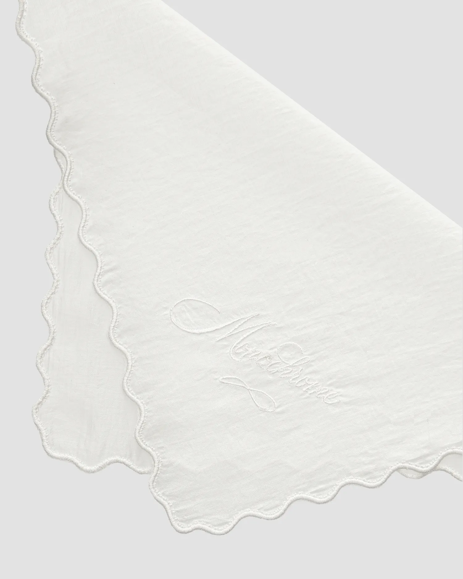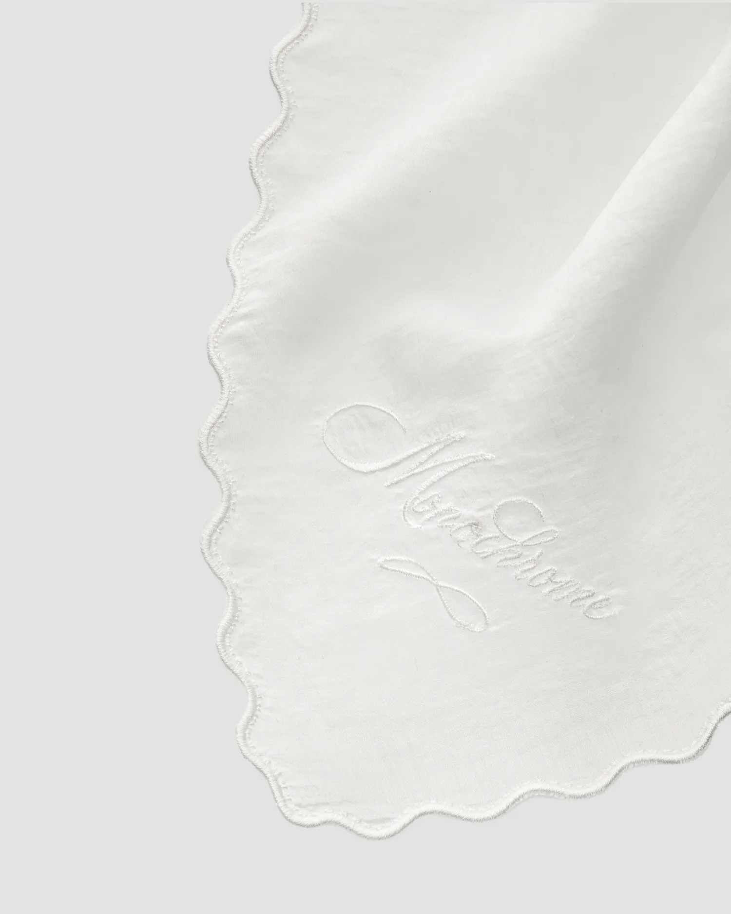 Платок с вышивкой логотипа Monochrome, разработанного специально для свадебной коллекции. Упаковка в подарочную коробку. Размер: 29,5 см. х 29,5 см.