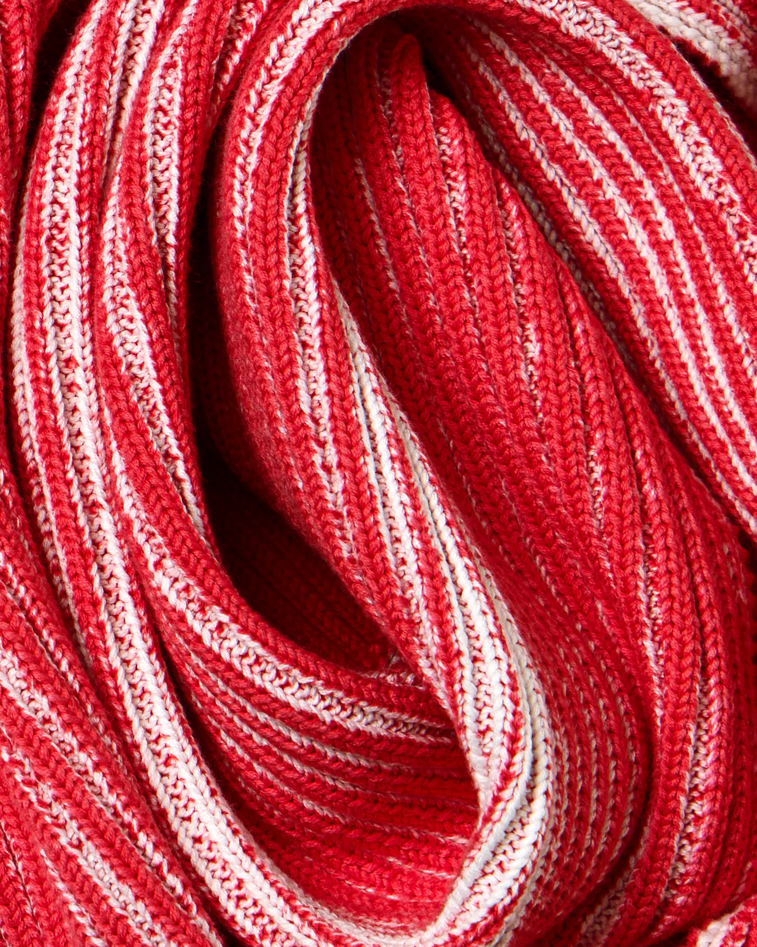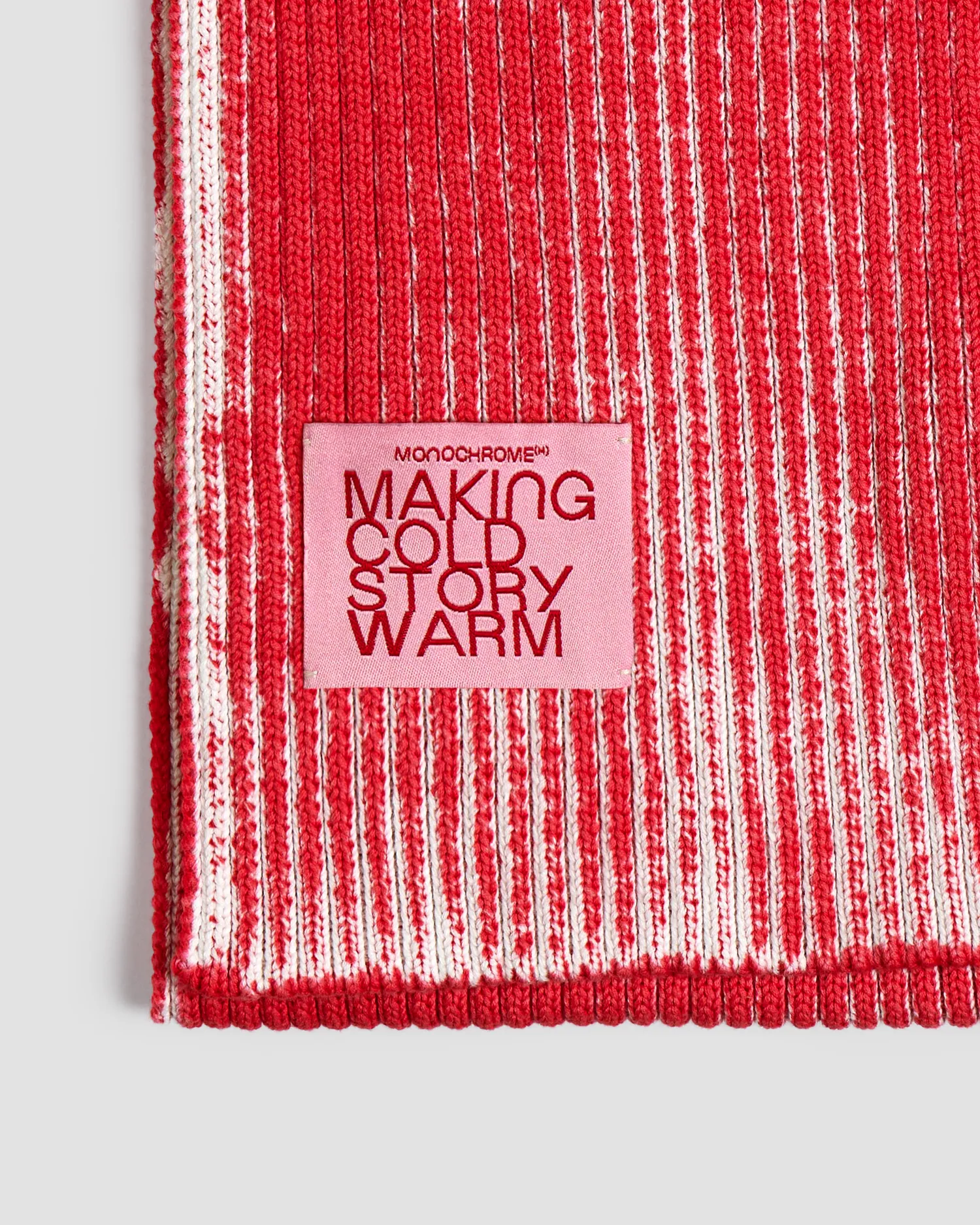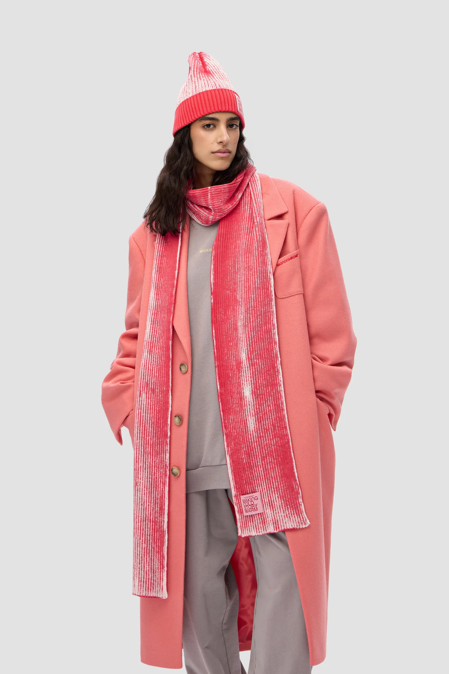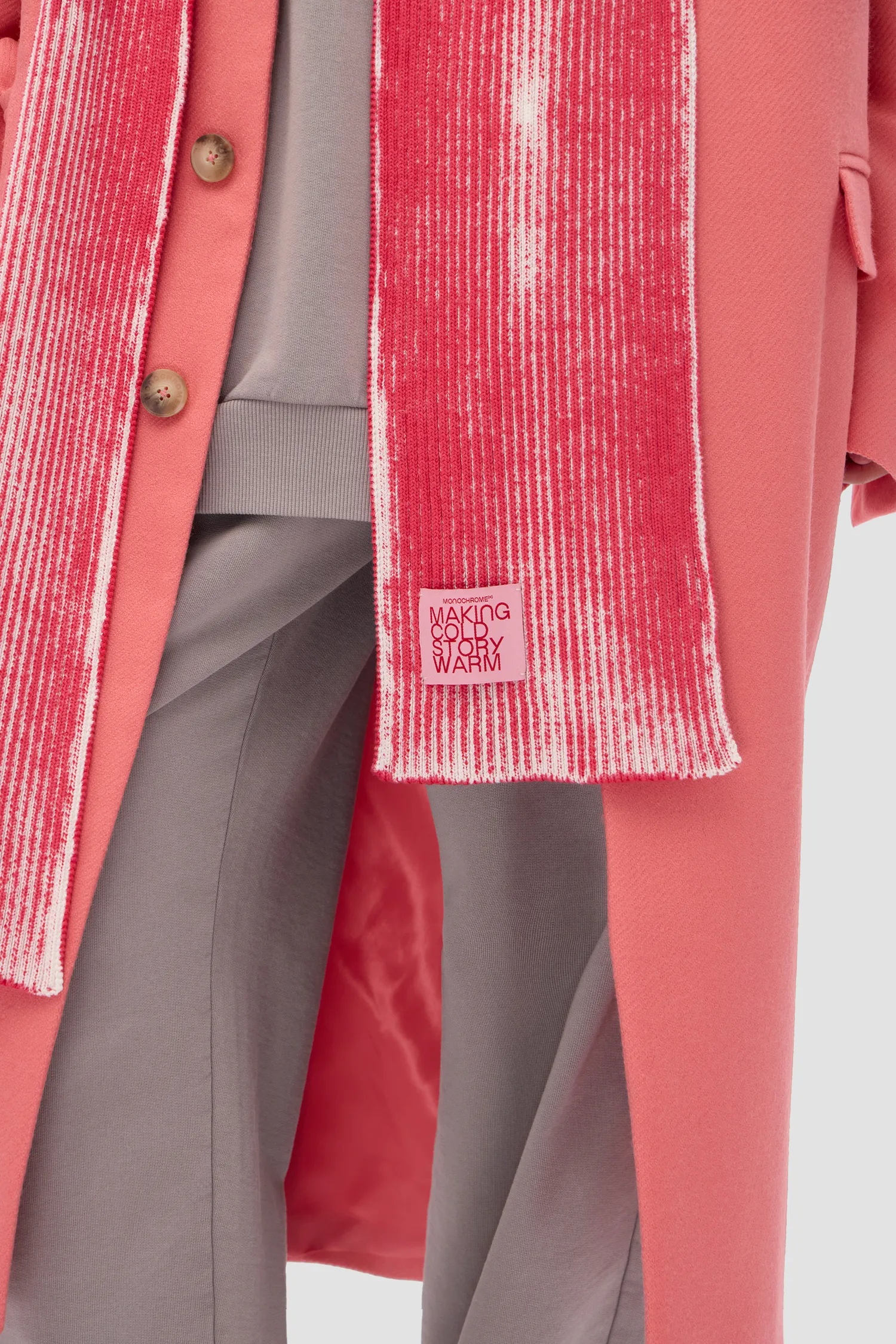 Удлиненный вязаный шарф из 100% хлопка кораллового цвета, выкрашен техникой garment dye. Обработанные края. Нашивной жаккардовый лейбл розового цвета. Упаковка в базовую коробку.