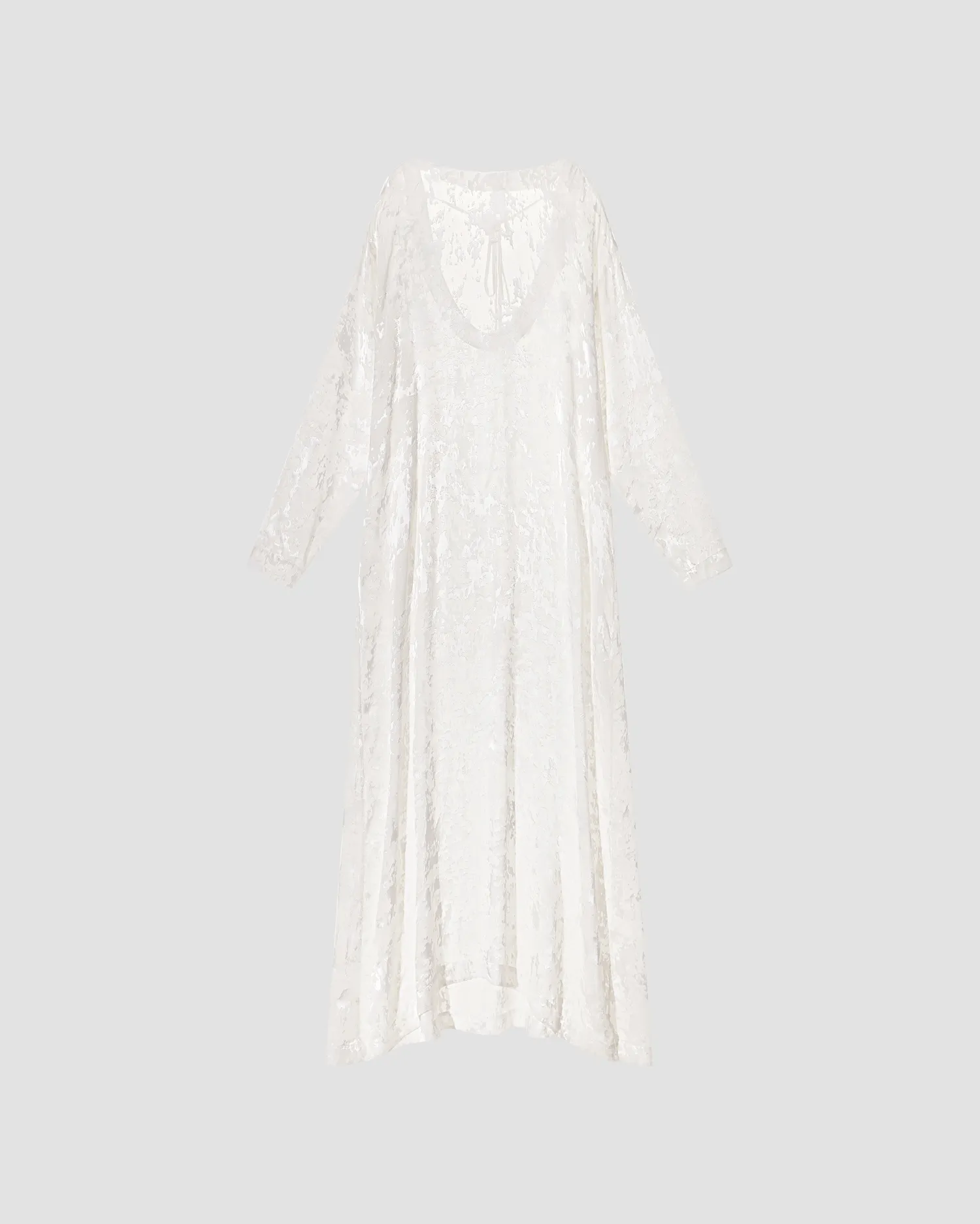 Полупрозрачное платье из смеси вискозы и шелка. Вырез на спине, дополненный завязками. Можно носить как самостоятельное изделие, так и в качестве второго слоя. Упаковка в подарочную коробку.