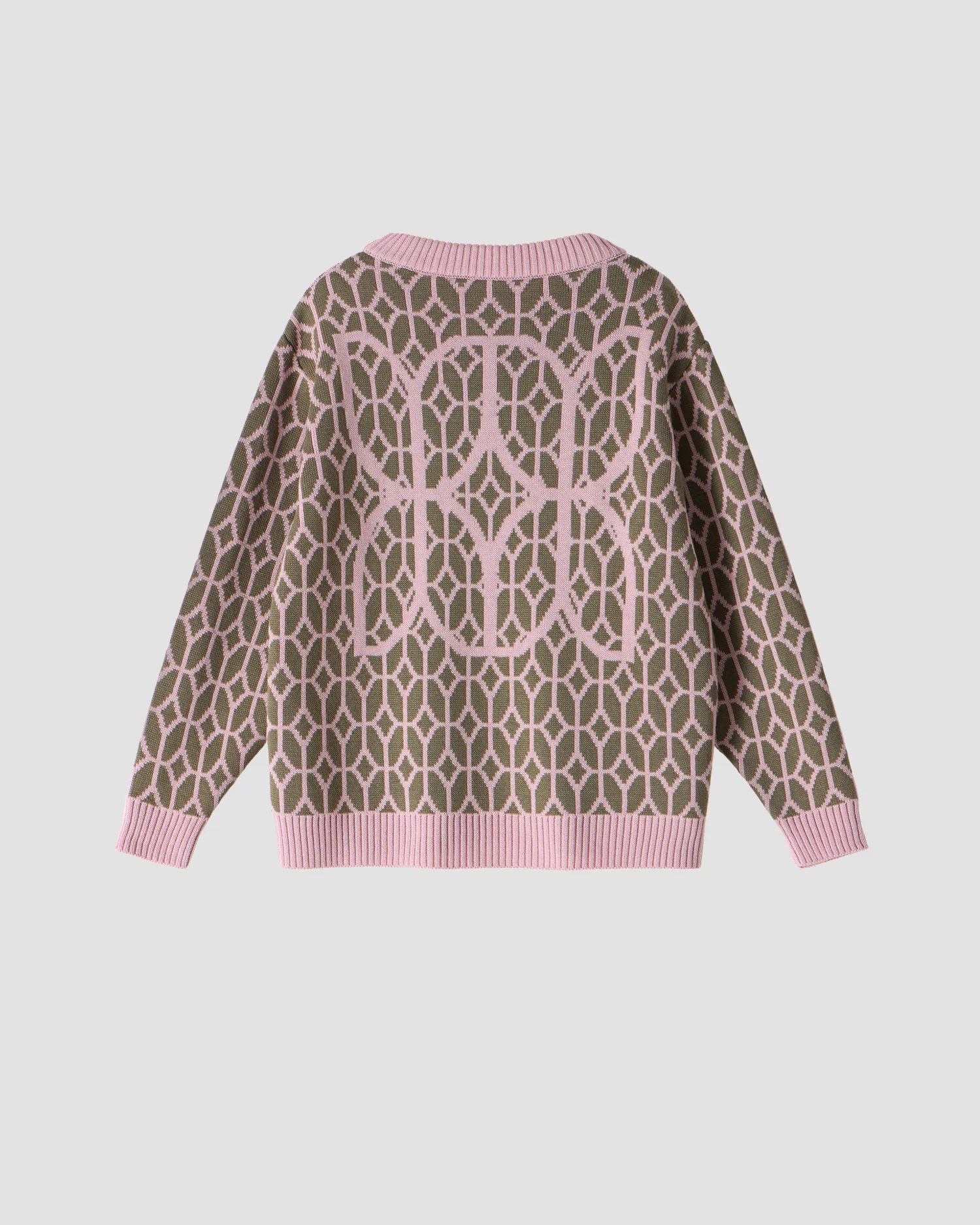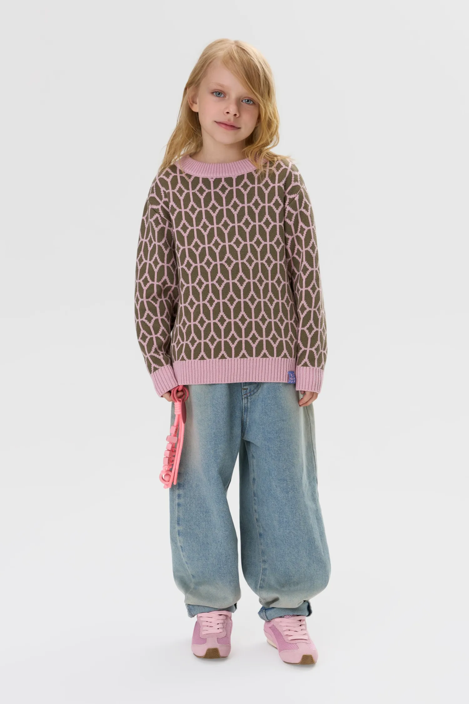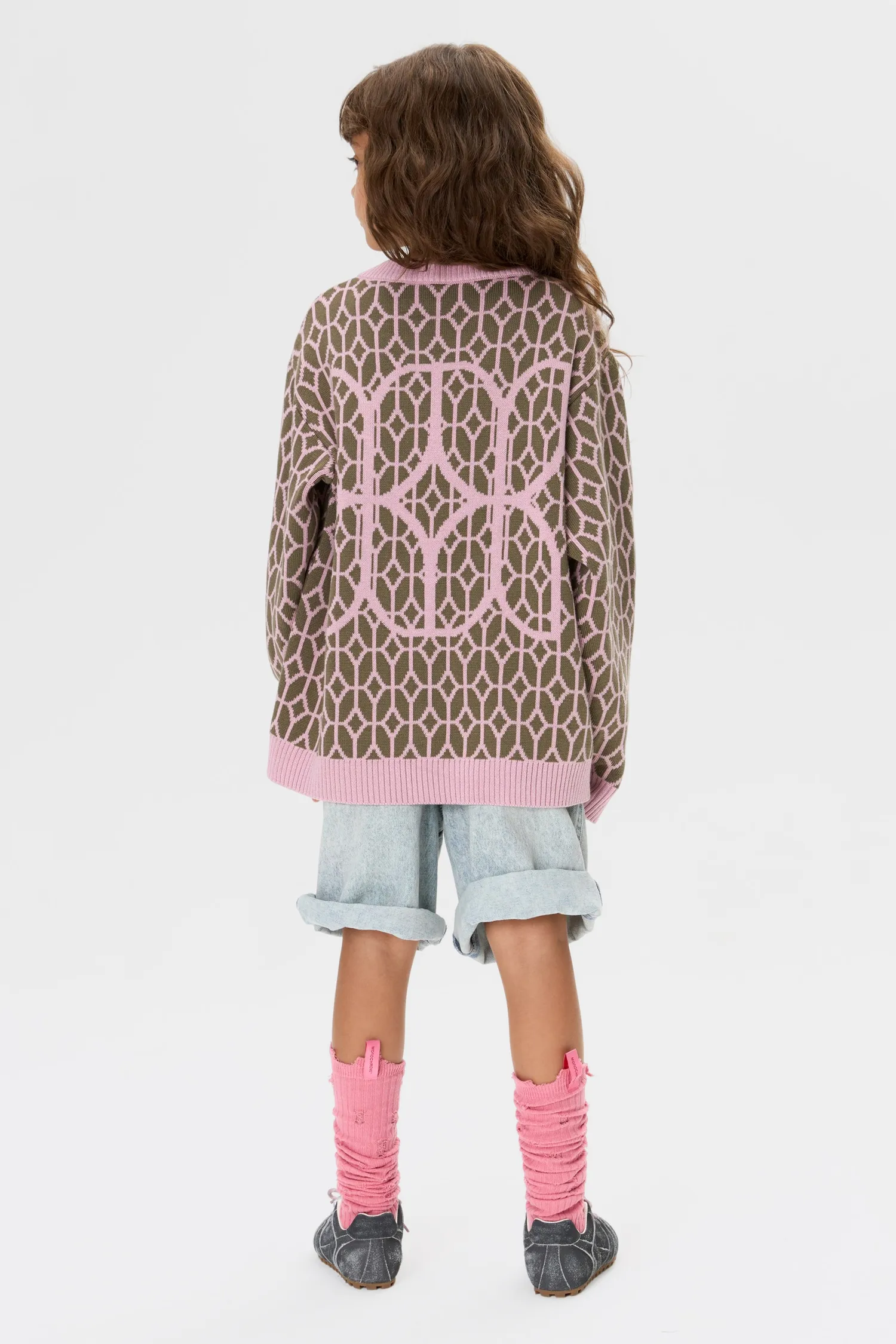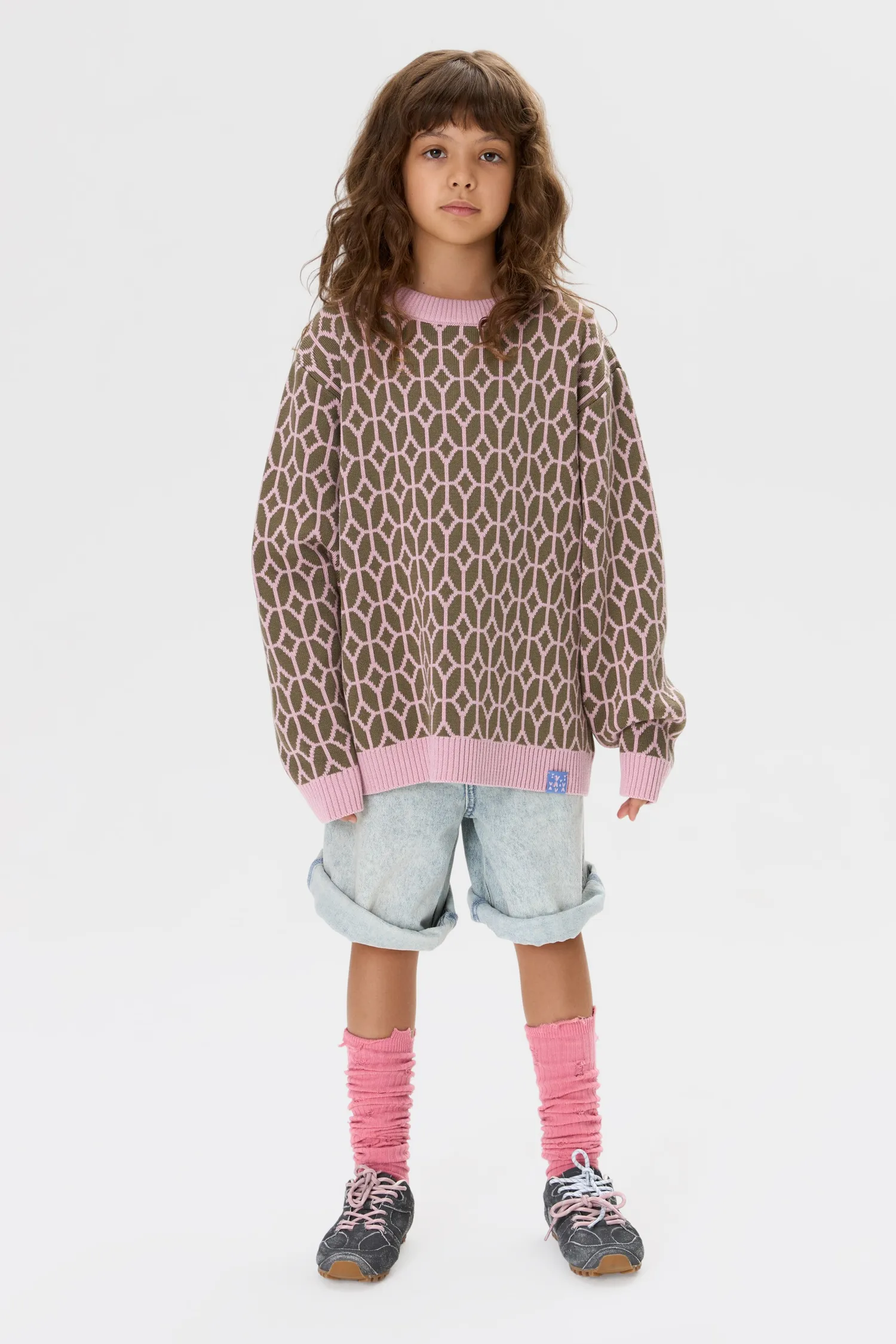 Вязаный свитер с изящным вязальным узором в виде фирменного PATTERN. Выполнен из смесового хлопка. Гладкая фактура вязки. О-образный вырез. На спинке крупный элемент фирменного паттерна в розовом цвете. Жаккардовый флажок по нижнем краю изделия в голубом цвете. Упаковка в подарочную коробку.