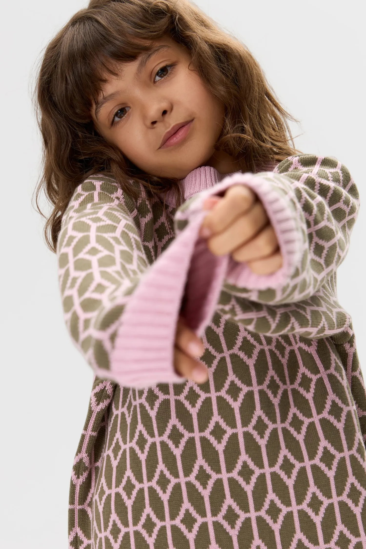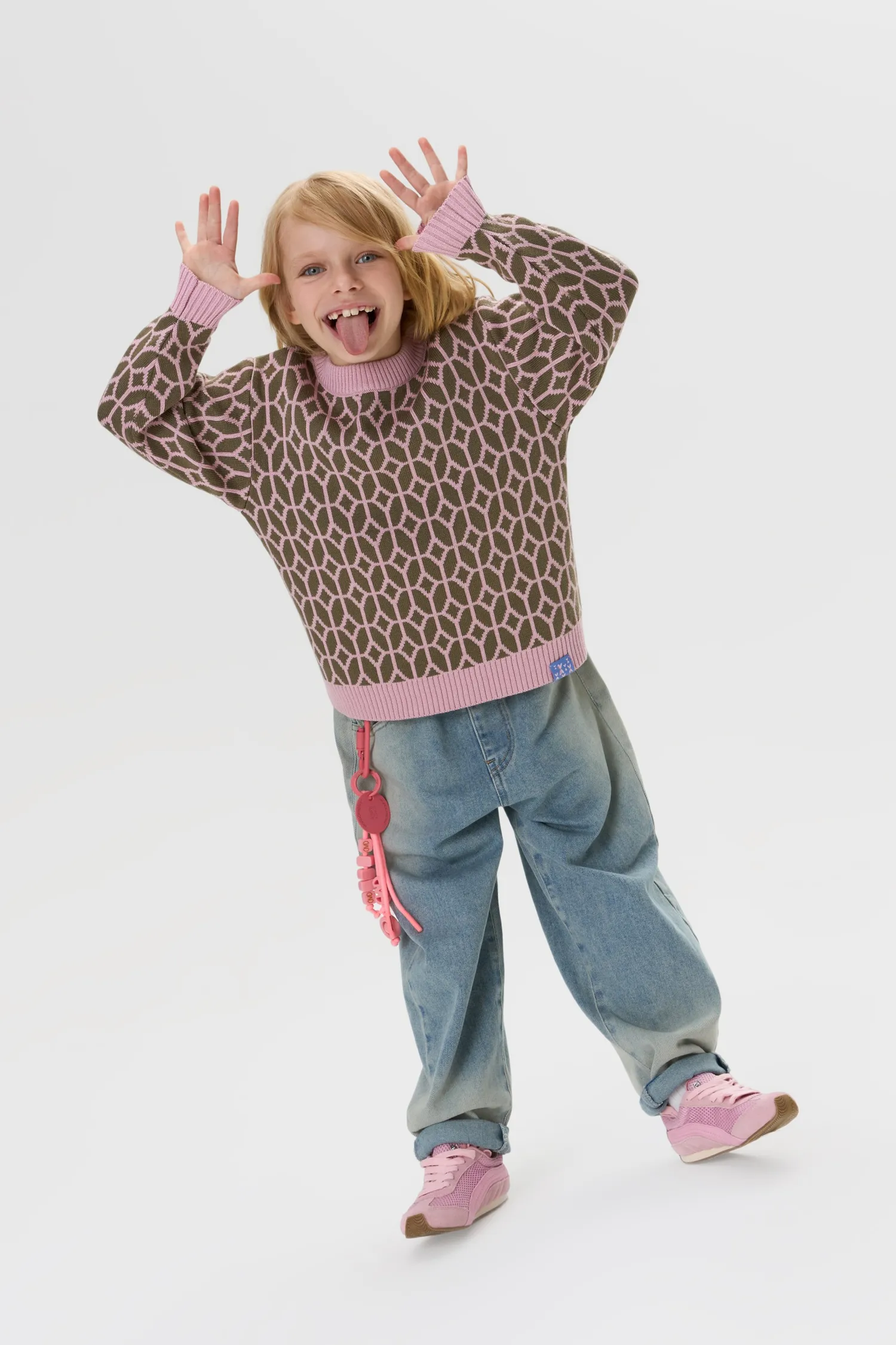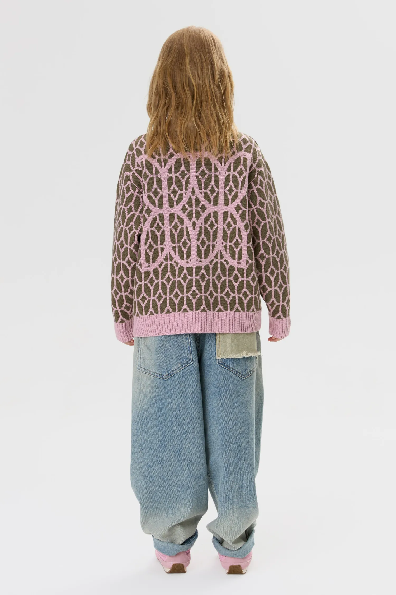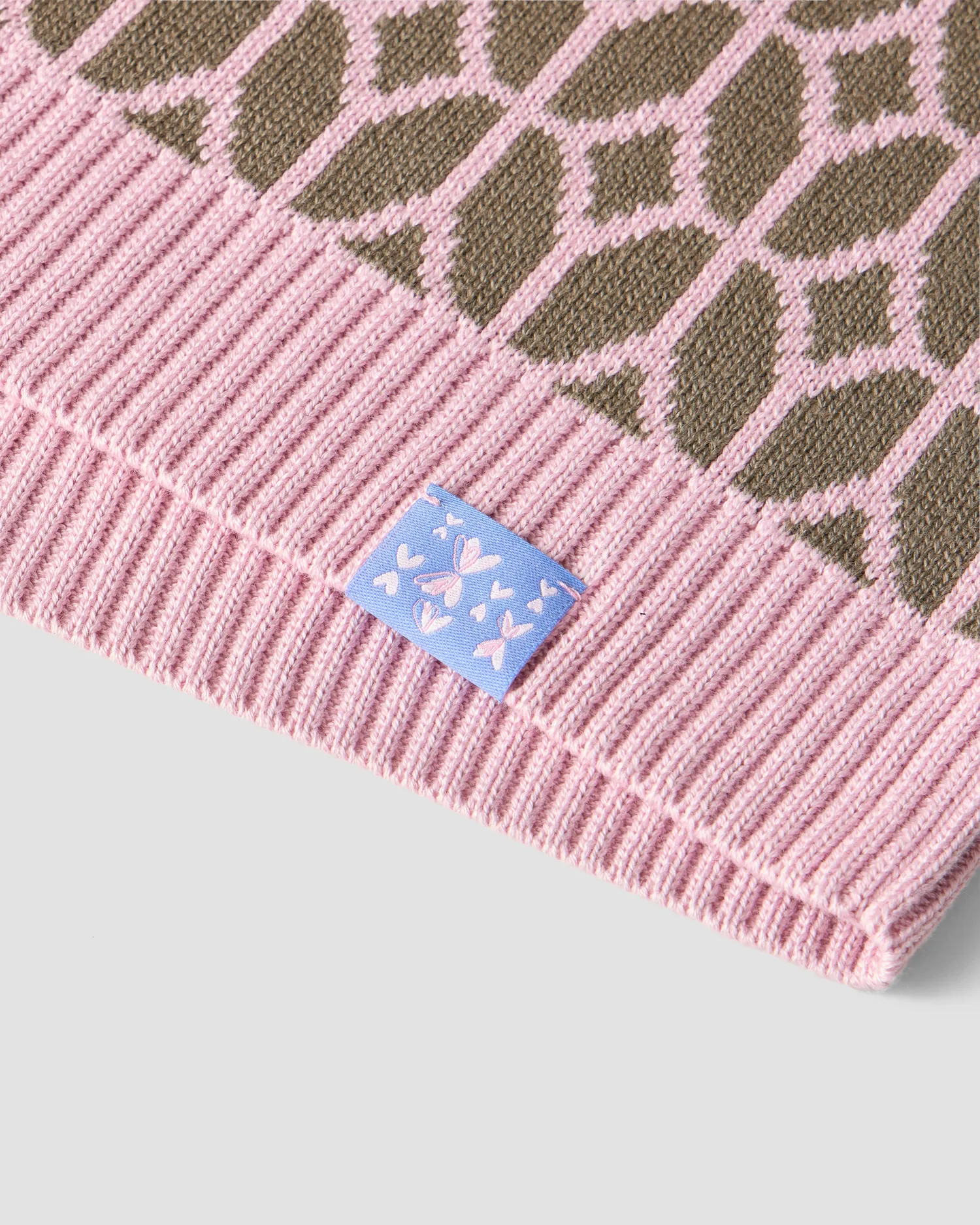 Вязаный свитер с изящным вязальным узором в виде фирменного PATTERN. Выполнен из смесового хлопка. Гладкая фактура вязки. О-образный вырез. На спинке крупный элемент фирменного паттерна в розовом цвете. Жаккардовый флажок по нижнем краю изделия в голубом цвете. Упаковка в подарочную коробку.