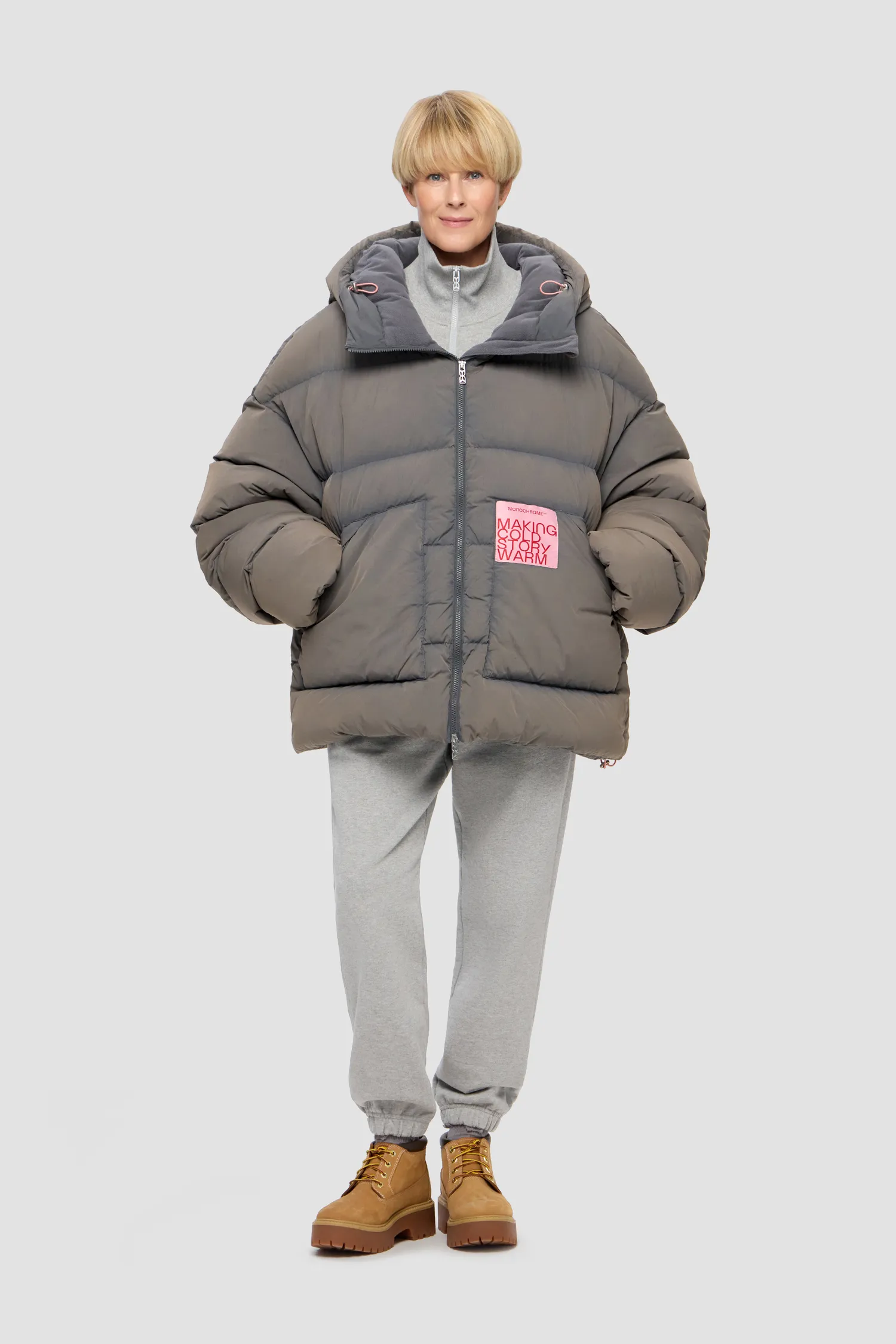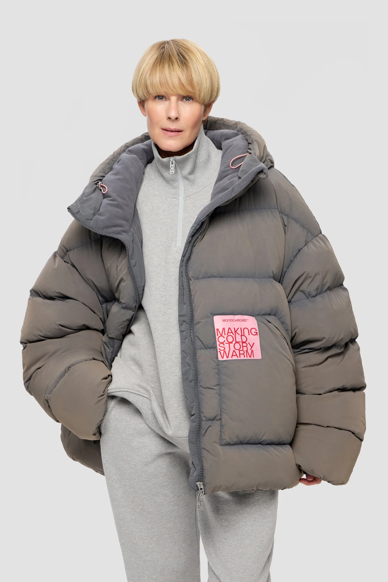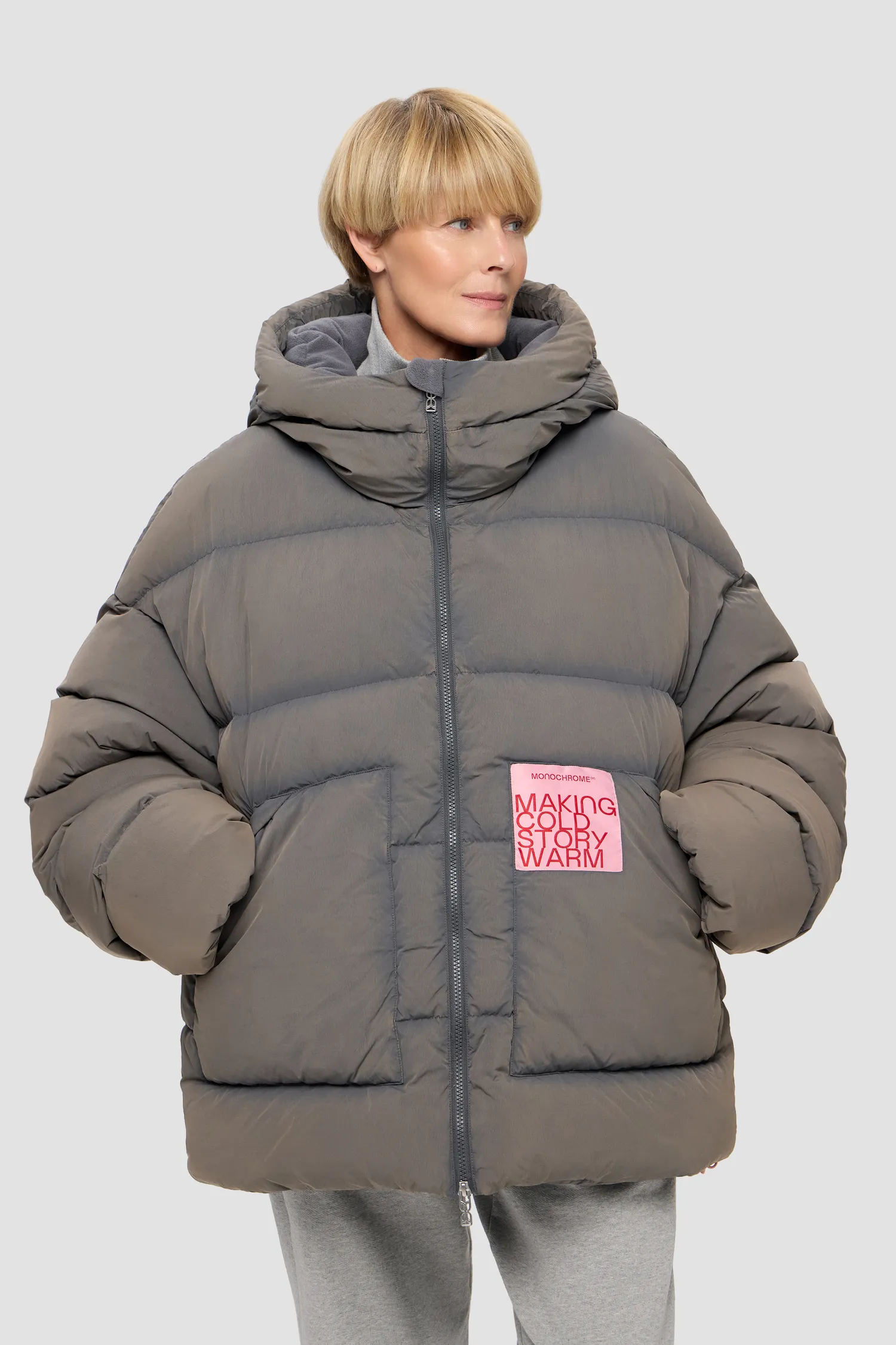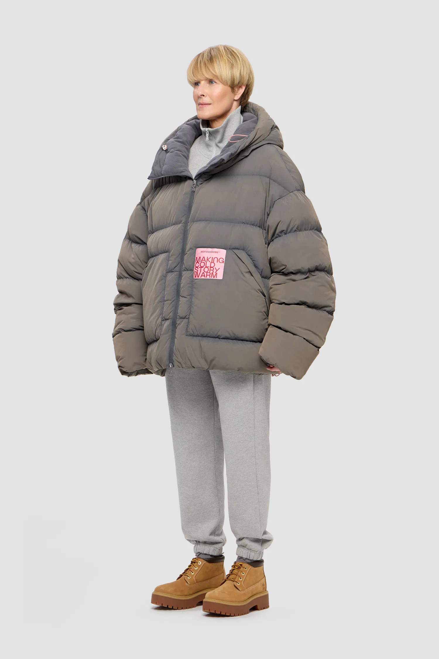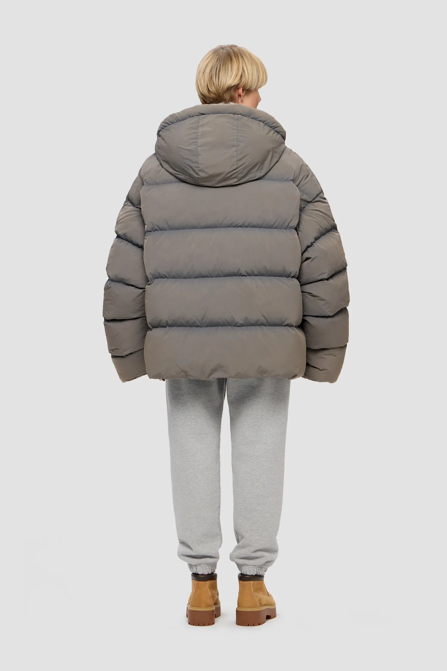 Oversized пуховик серого цвета. Окрашен по специальной технологии: изделие в готовом виде окрашивают специальным составом, что делает каждый пуховик уникальным. Основной материал: 100% полиэстер; наполнитель: 90% утиный пух / 10% перо (по стандартам RDS*). Влагоотталкивающая обработка ткани. Молнии с защитой от ветра и влаги, брендированные кнопки. Ранцевые лямки на внутренней стороне изделия, позволяющие носить пуховик за плечами. На данной модели капюшон не отстегивается. Накладные карманы с мягким флисом на внутренней стороне. Температурный режим до -25°C. Эластичные манжеты. Кулиски по нижнему краю и на капюшоне. Нашивной жаккардовый лейбл. Страна-производитель: КНР. Упаковка в фирменную крафтовую коробку.