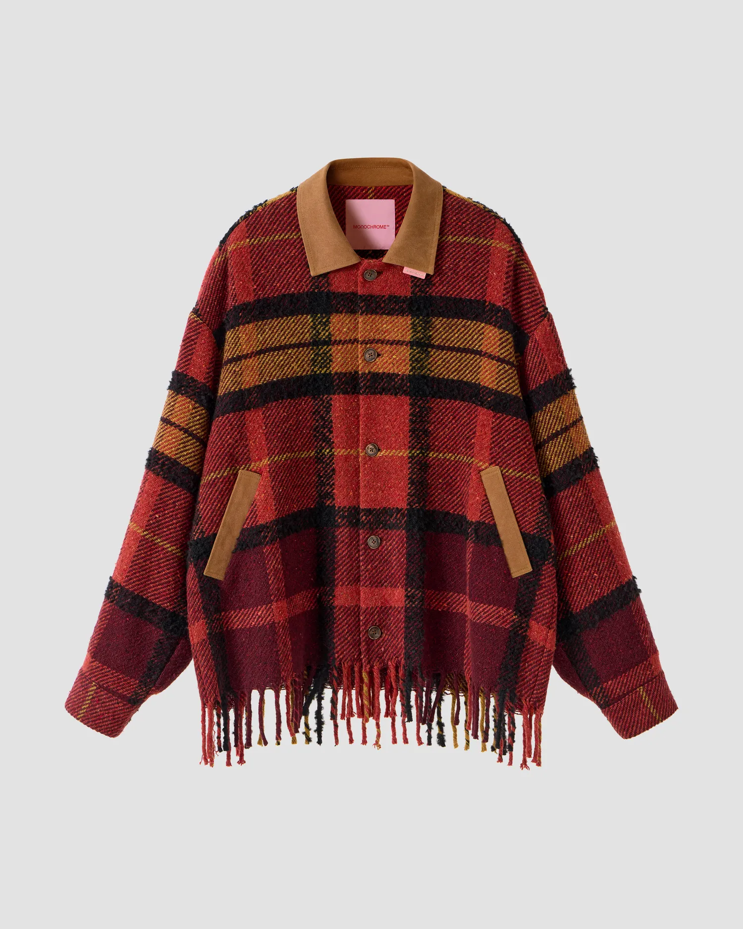 Жакет свободного кроя с бахромой по нижнему краю из коллекции VILLAGE'25. Выполнен из смесовой шерсти в крупную клетку. Отлетная подкладка. Тип застежки: металлические пуговицы с винтажным эффектом. Отложной воротник. Скрытые боковые карманы. Листочка карманов выполнена из канваса с эффектом состаривания. Упаковка в подарочную коробку.