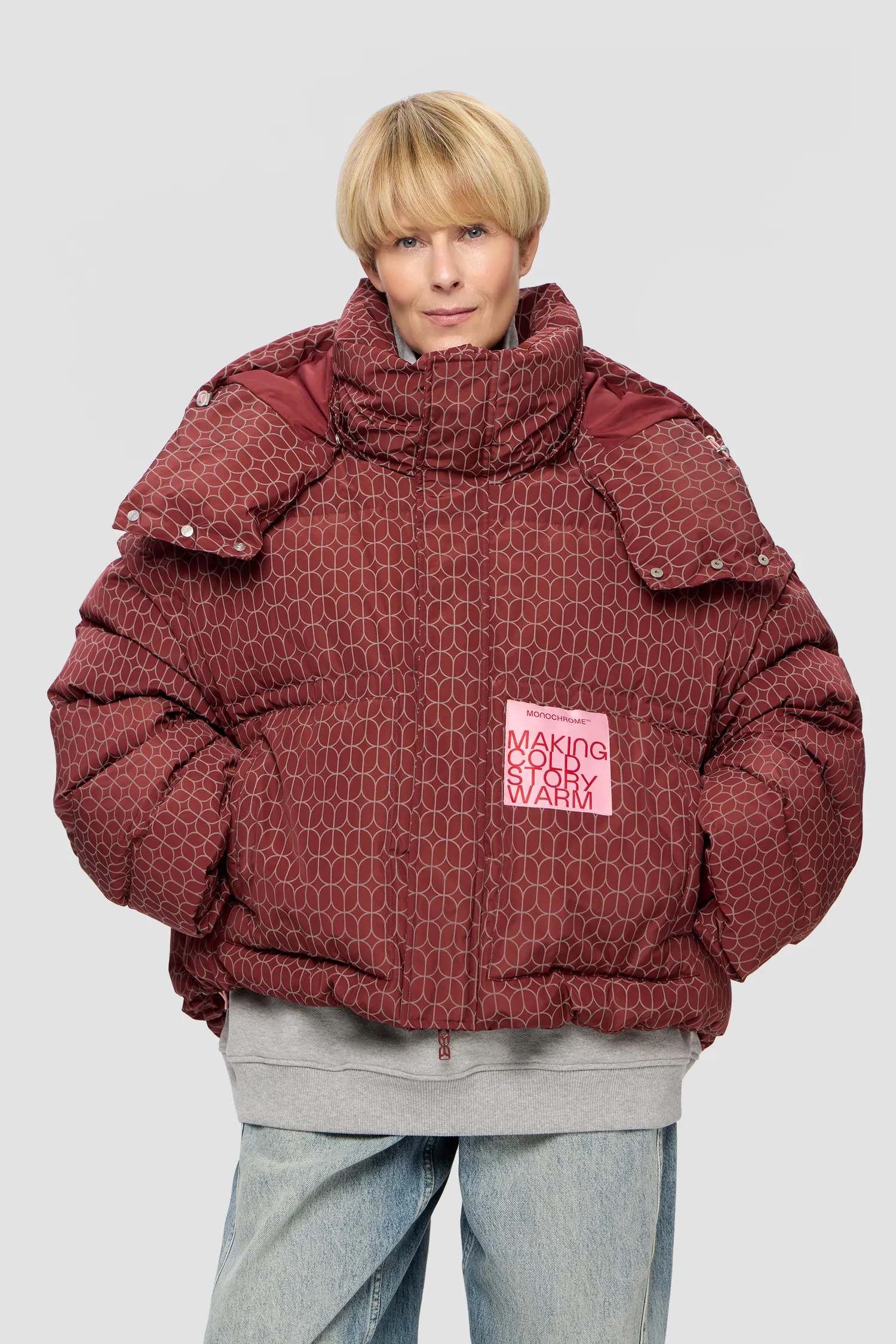 Укороченный oversized пуховик-трансформер винного цвета со светоотражающим принтом в виде фирменного паттерна MONOCHROME. Отстегивающиеся рукава и капюшон. Влагоотталкивающая обработка ткани. Основной материал: 100% полиэстер, наполнитель: 90% утиный пух / 10% перо (по стандартам RDS*). Идеально для морозной погоды до -20°C. Утепленные боковые карманы. Молнии с защитой от ветра и влаги, брендированные кнопки. Ранцевые лямки на внутренней стороне изделия, позволяющие носить пуховик за плечами. Кулиски по нижнему краю и на капюшоне. Нашивной жаккардовый лейбл в области кармана. Эластичные манжеты. Страна-производитель: КНР. Упаковка в фирменную крафтовую коробку.