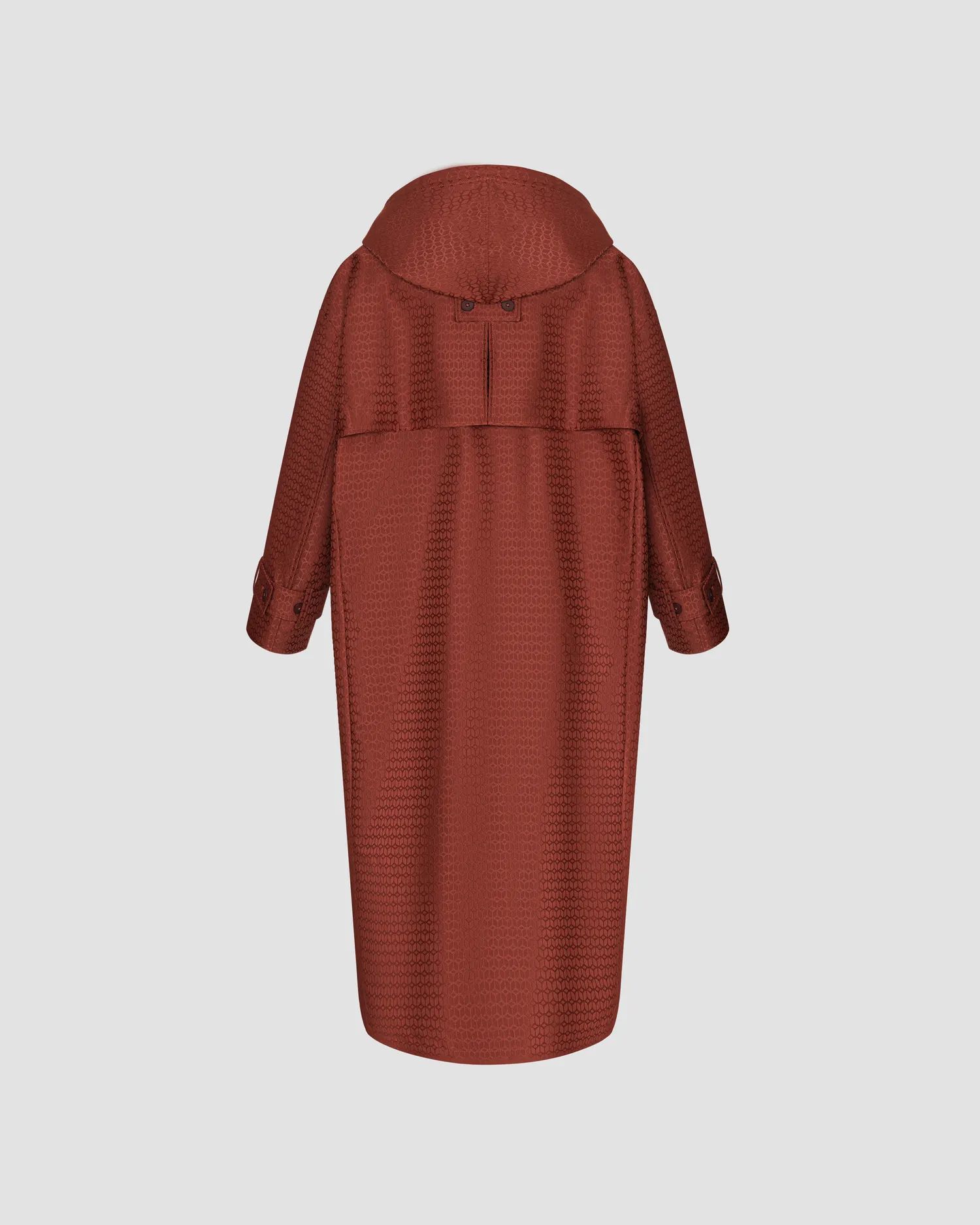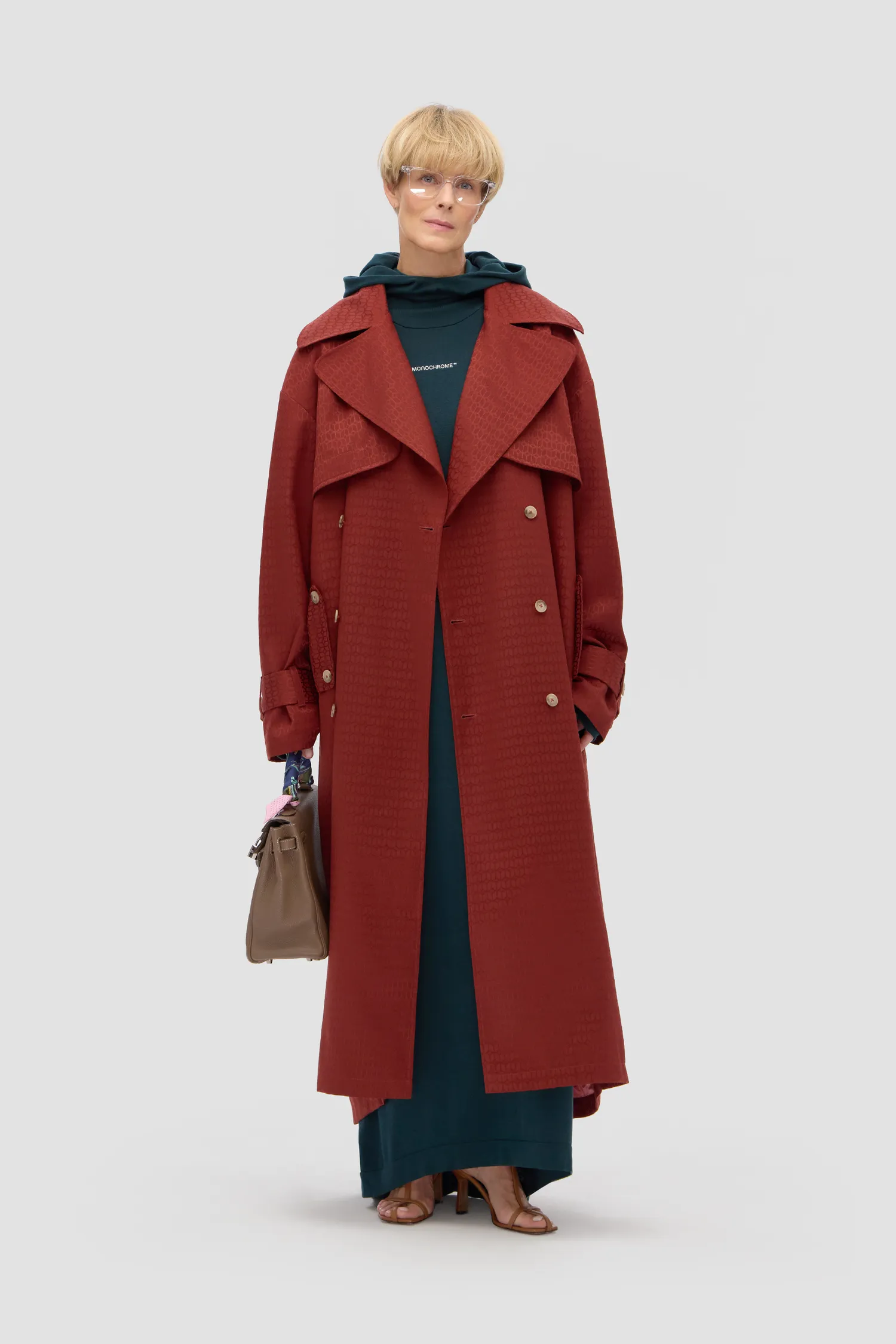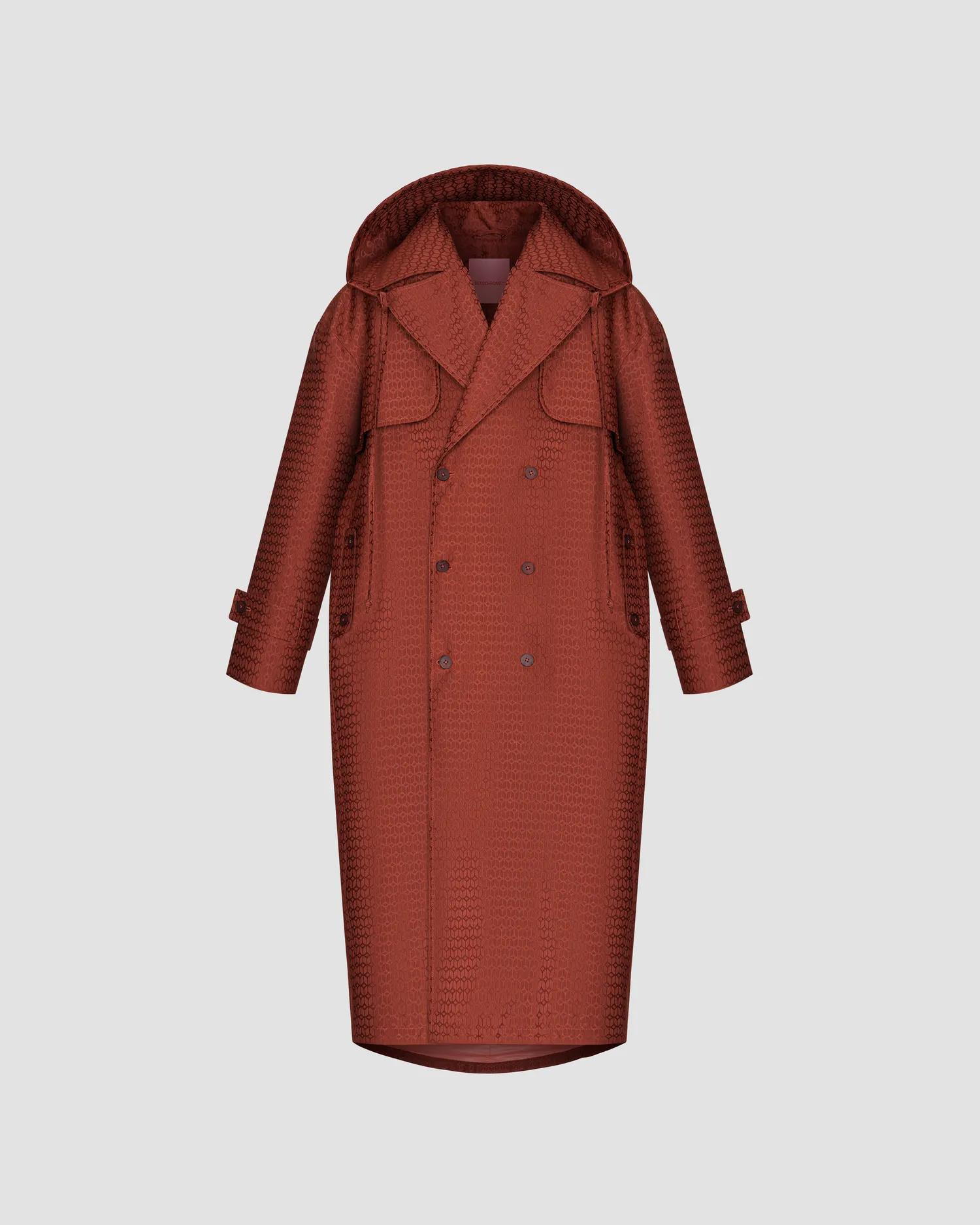 Двубортный тренч из фактурной ткани с фирменным паттерном MONOCHROME. Ткань пропитана специальным составом, отталкивающим влагу. Подклад выполнен из ткани с вискозой в составе, обеспечивающей комфорт при использовании изделия. Отстегивающийся капюшон. Регулируемая длина пояса и патов на манжетах рукавов. Пуговицы с выгравированной айдентикой MONOCHROME™. Сделано в России на собственной мануфактуре MONOCHROME.