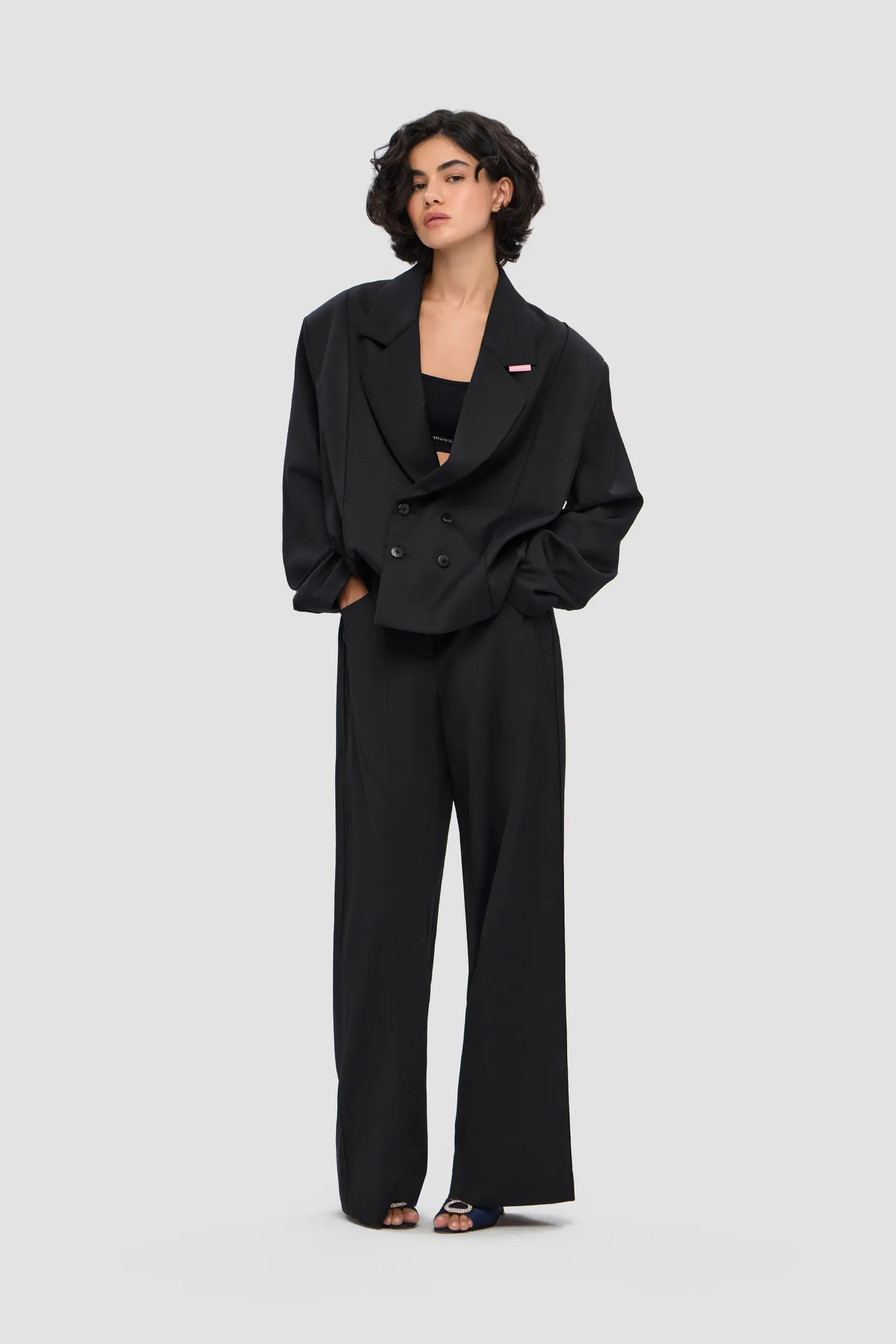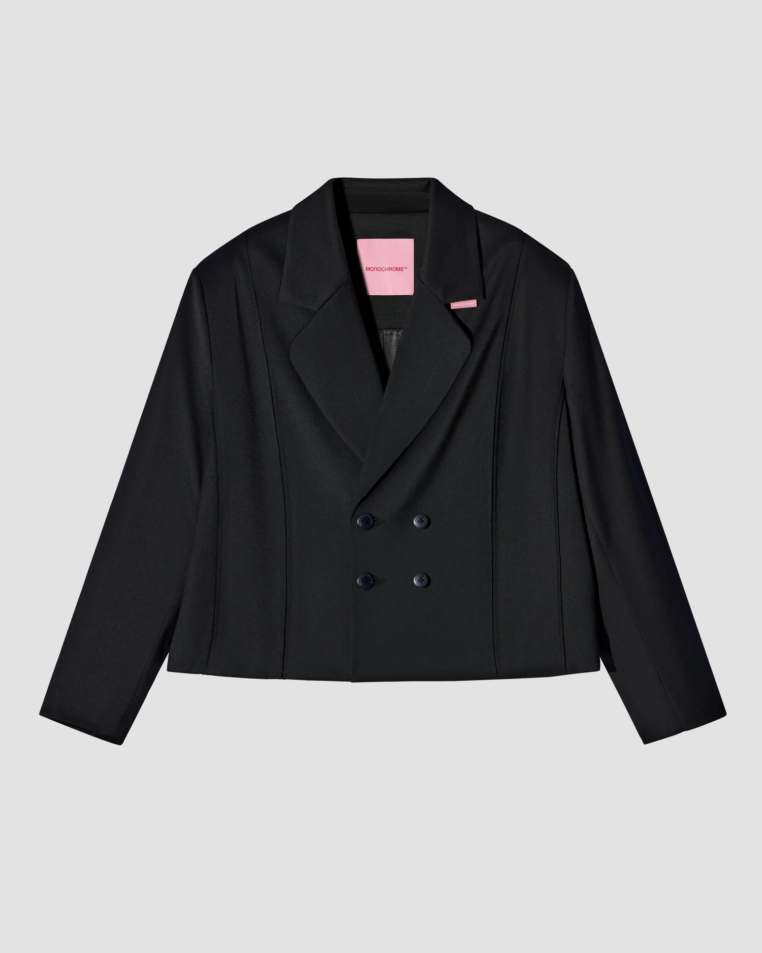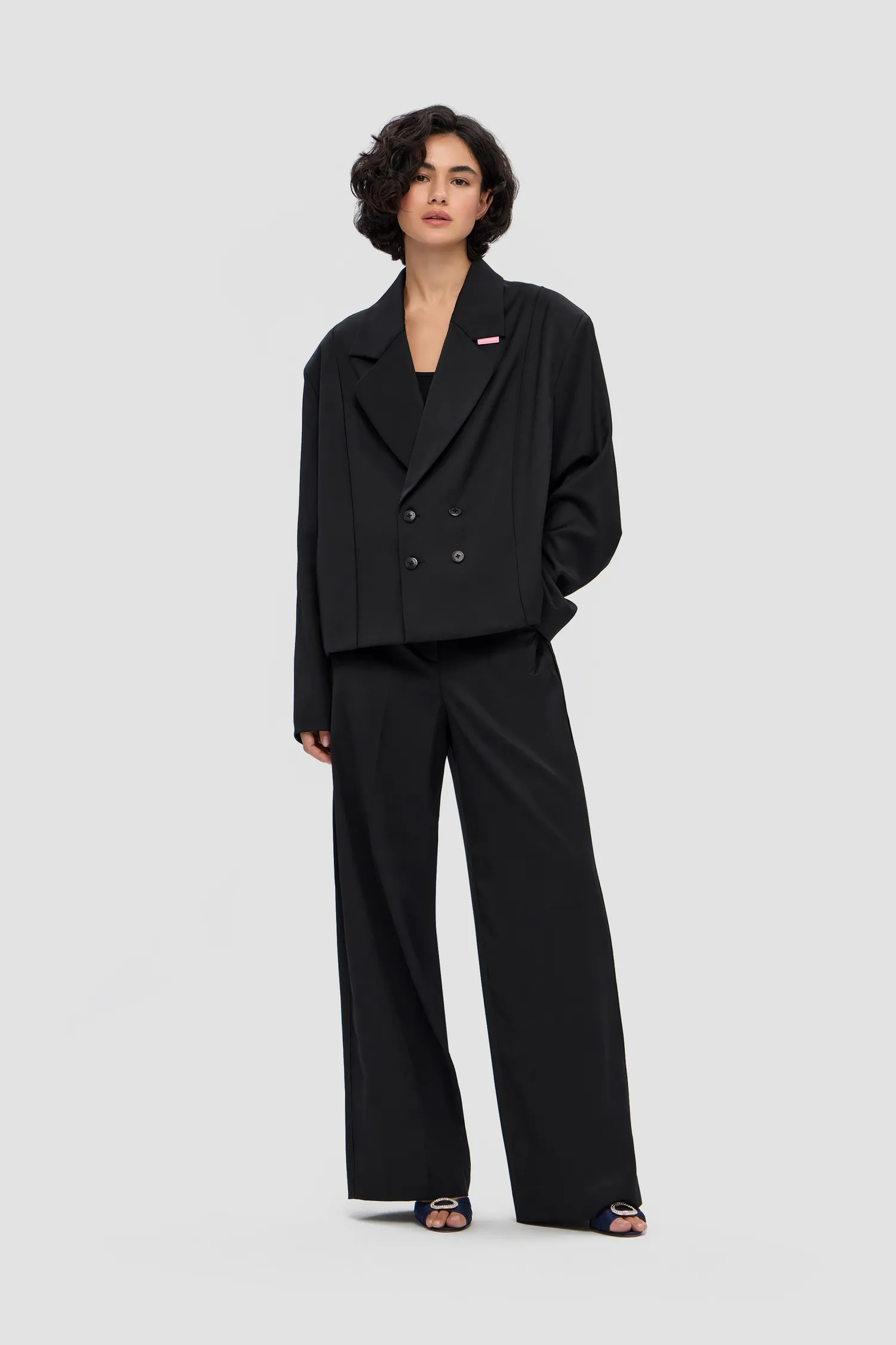 Двубортный укороченный жакет, выполненный из 100% шерсти в черном цвете. Onesize. Полимерная нашивка розового цвета с логотипом на лацкане. Тип застежки: брендированные пуговицы. Натуральный подклад с вискозой в составе позволяет телу "дышать". Упаковка в подарочную коробку.