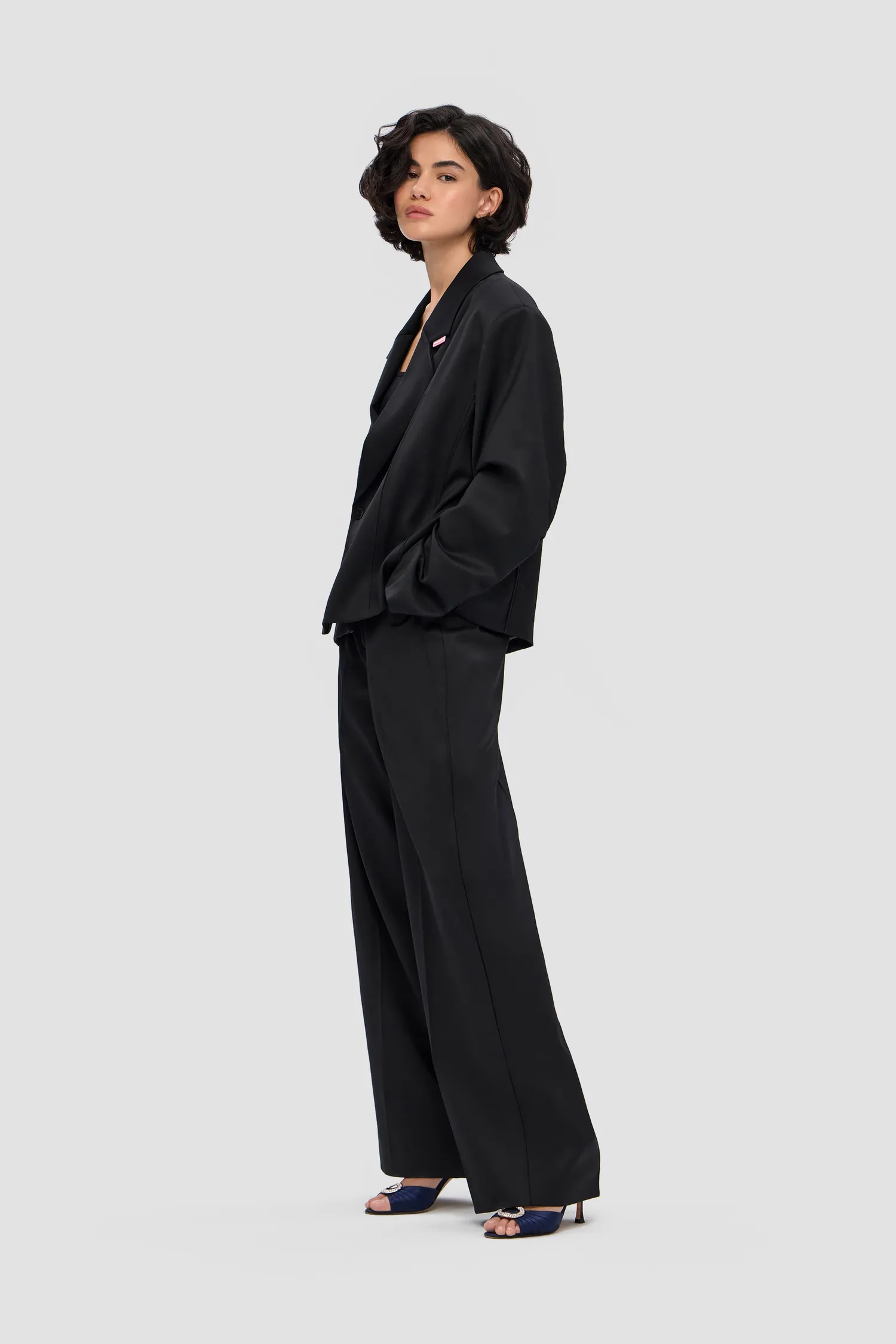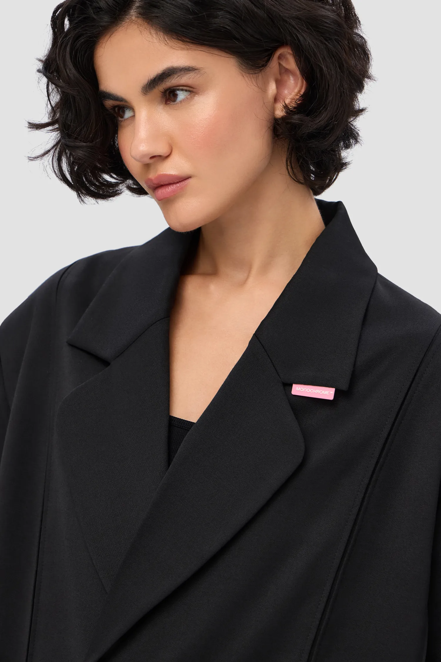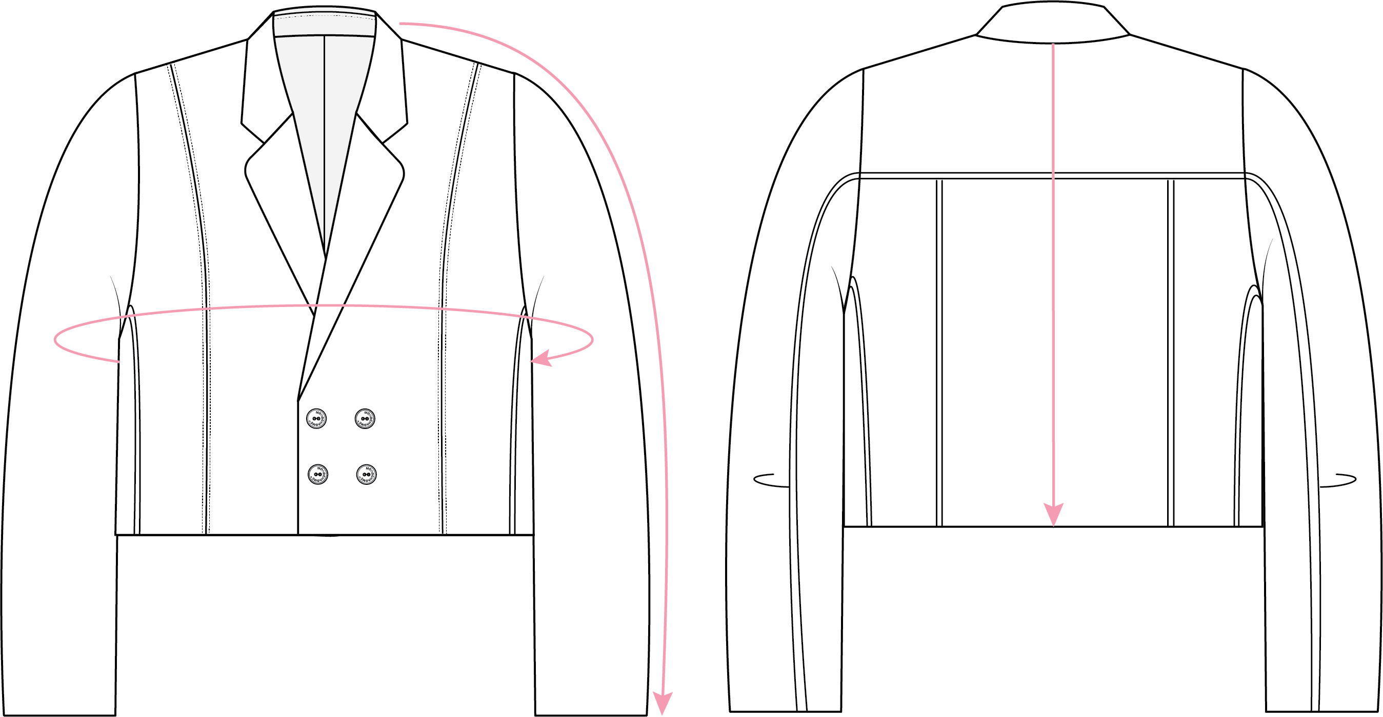 Двубортный укороченный жакет, выполненный из 100% шерсти в черном цвете. Onesize. Полимерная нашивка розового цвета с логотипом на лацкане. Тип застежки: брендированные пуговицы. Натуральный подклад с вискозой в составе позволяет телу "дышать". Упаковка в подарочную коробку.