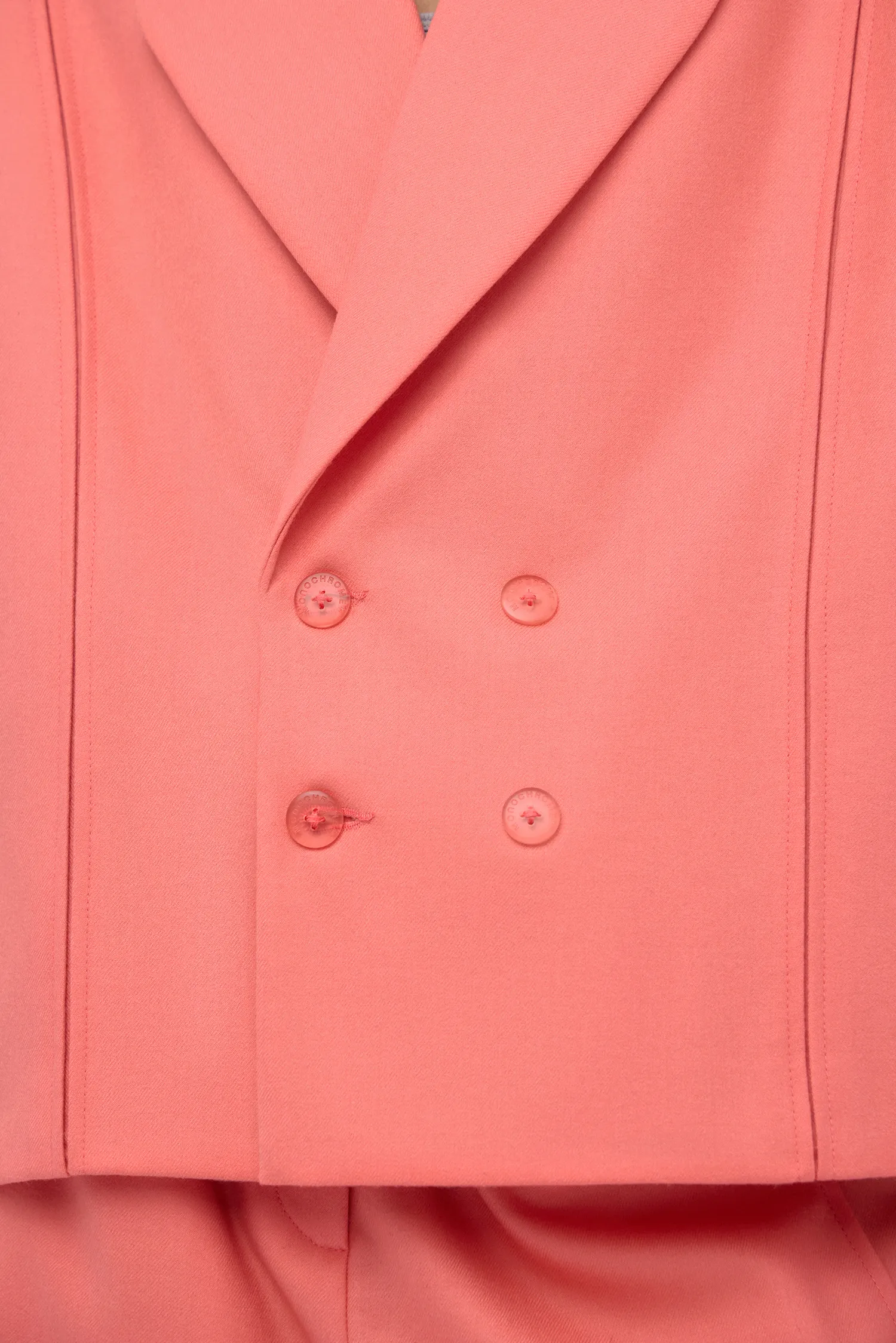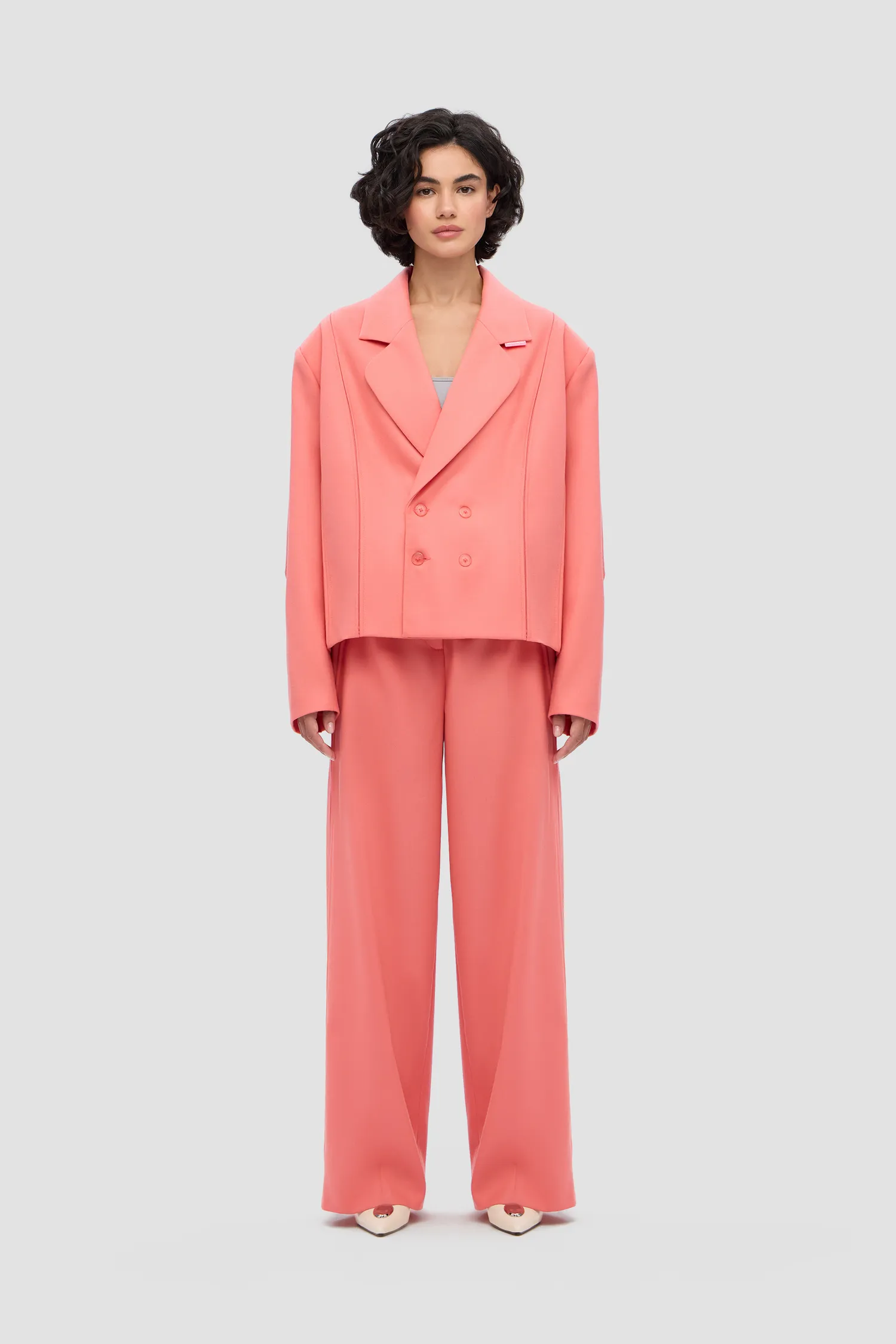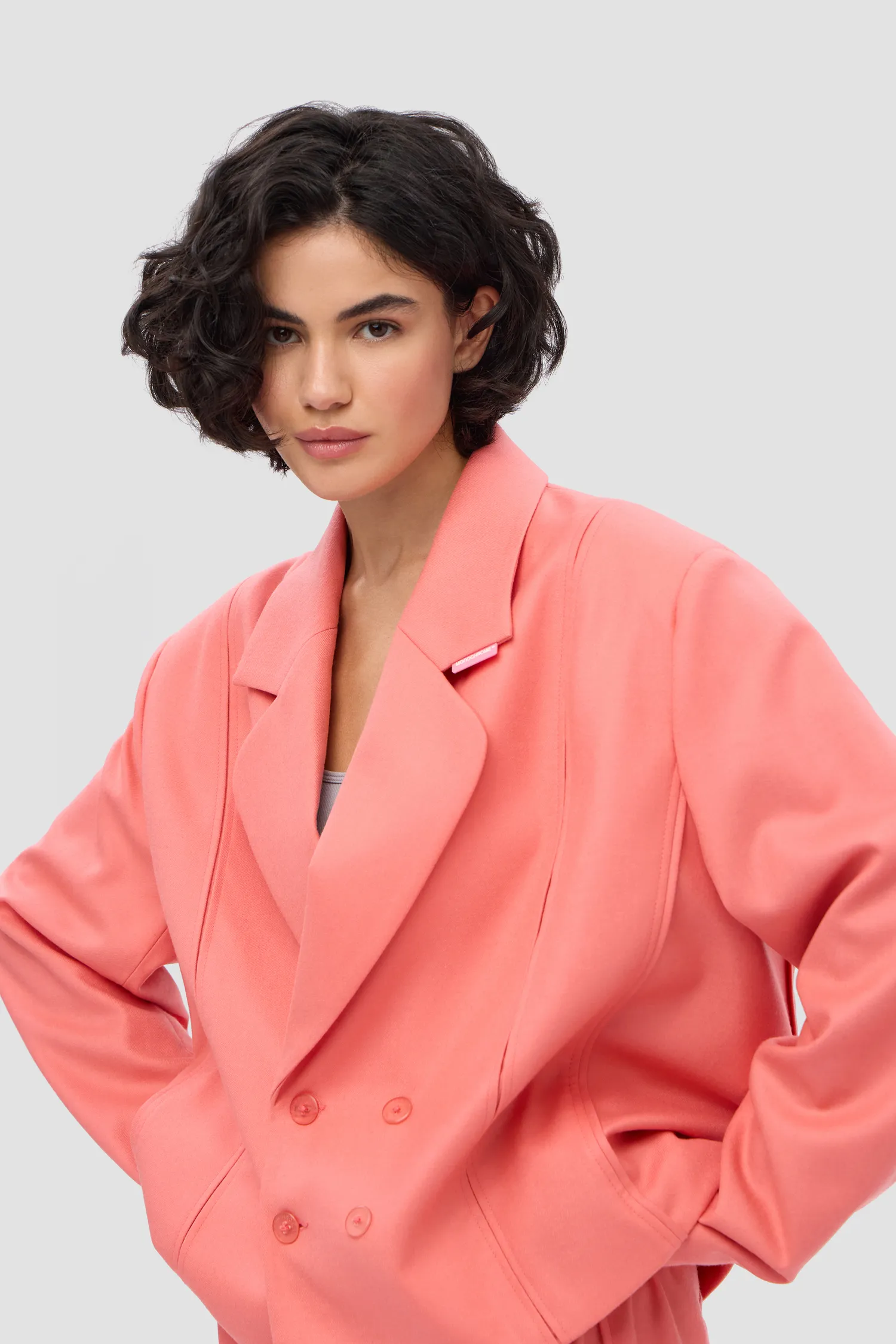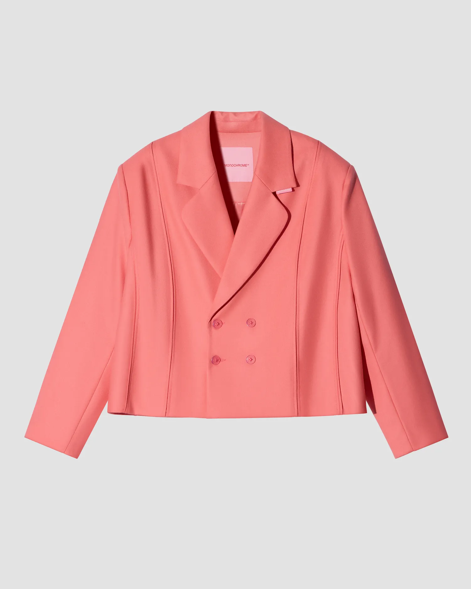 Двубортный укороченный жакет, выполненный из 100% шерсти в розовом цвете. Onesize. Полимерная нашивка розового цвета с логотипом на лацкане. Тип застежки: брендированные пуговицы. Натуральный подклад с вискозой в составе позволяет телу "дышать". Упаковка в подарочную коробку.