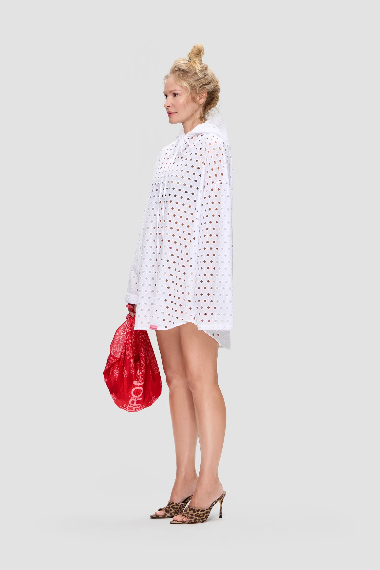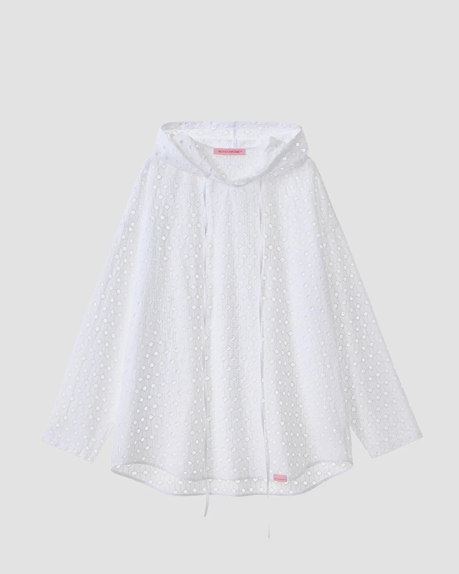 Оверсайз туника с капюшоном на завязках. Легкая ажурная ткань-шитьё из 100% хлопка. Жаккардовый лейбл по нижнему краю изделия розового цвета. Упаковка в подарочную коробку.