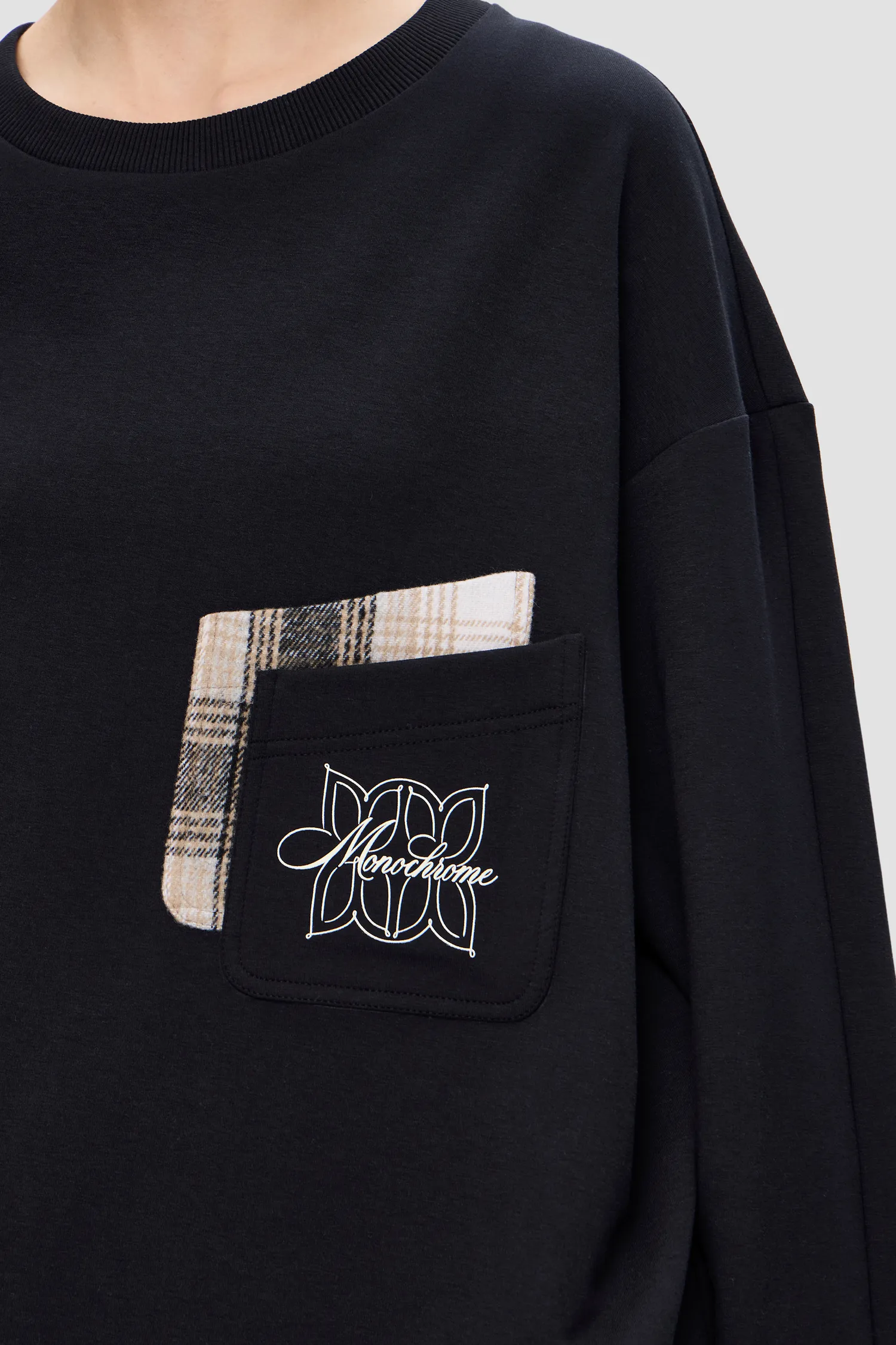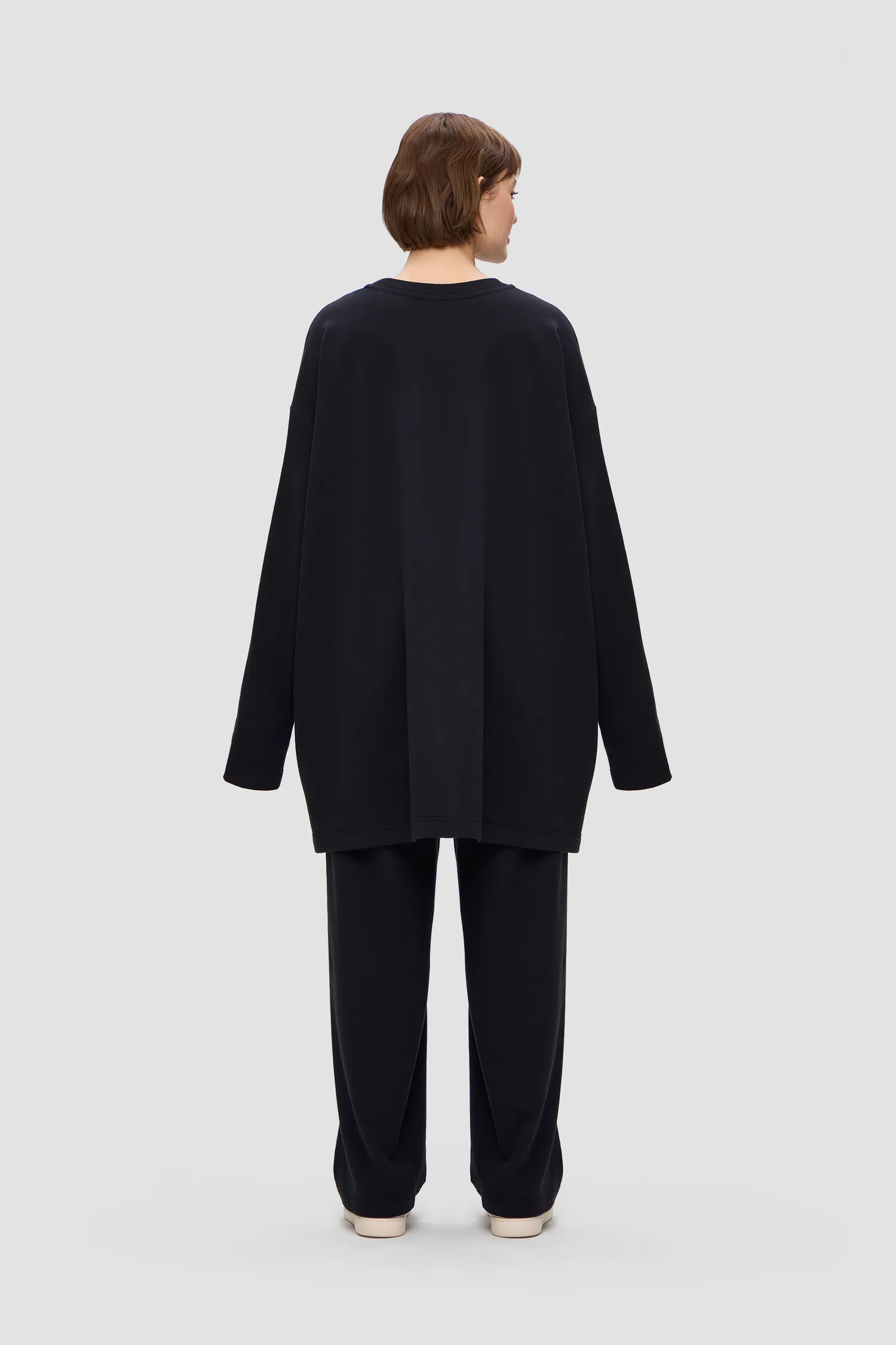 Домашний костюм из хлопкового футера. Удлиненный лонгслив с о-образным воротником. Двойной нагрудный карман с рельефным логотипом MONOCHROME и звеньями фирменного паттерна. Брюки на резинке из струящейся ткани с завязками. Скрытые карманы в боковых швах брюк. Упаковка в подарочную коробку. Сделано в России на собственной мануфактуре MONOCHROME.