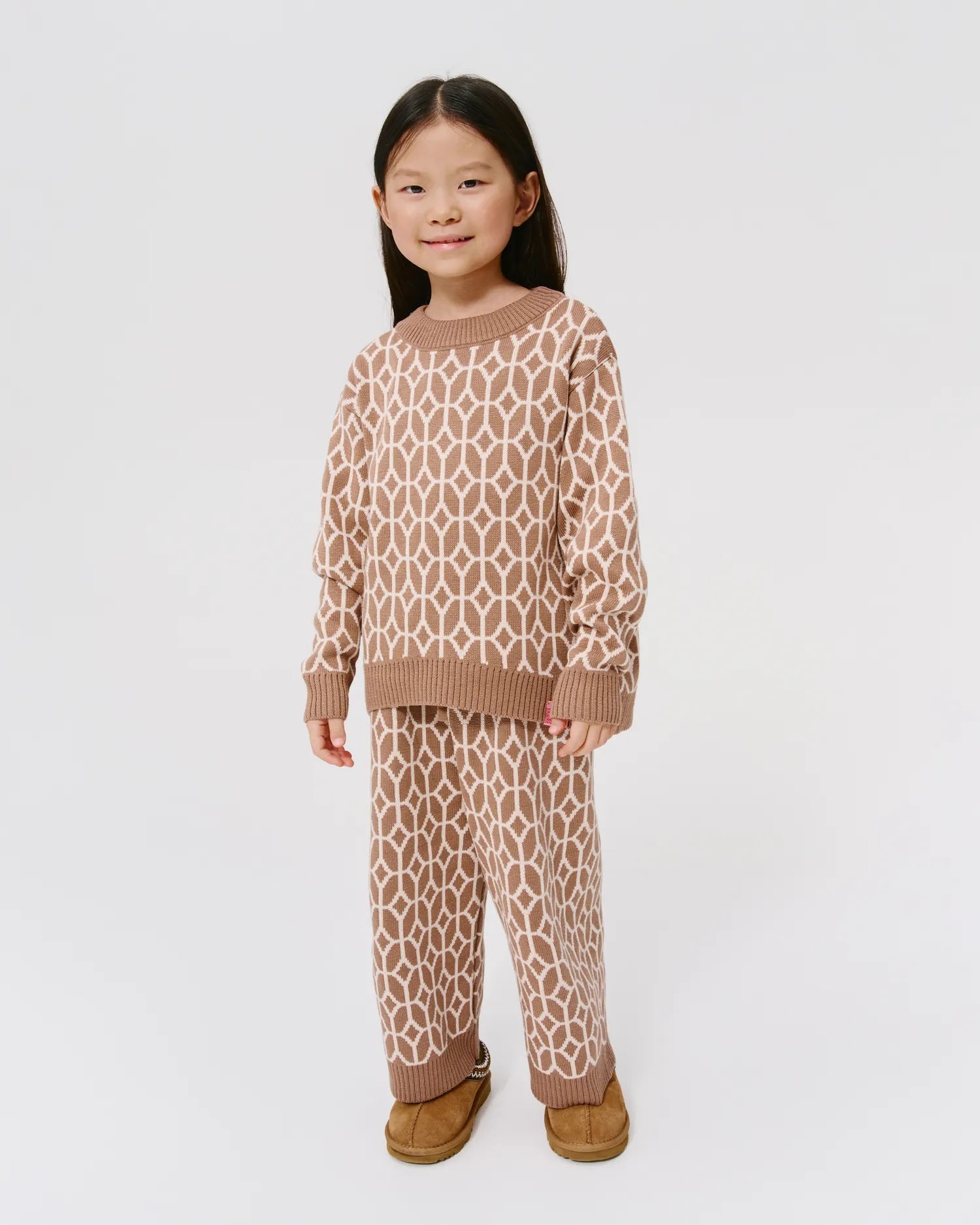 Вязаный детский комплект из свитера и брюк. Изящный вязальный узор в виде фирменного PATTERN. Пояс на резинке с завязками на брюках. Каждое изделие из комплекта может быть использовано в качестве самостоятельного предмета гардероба или комбинироваться с другими изделиями MONOCHROME.