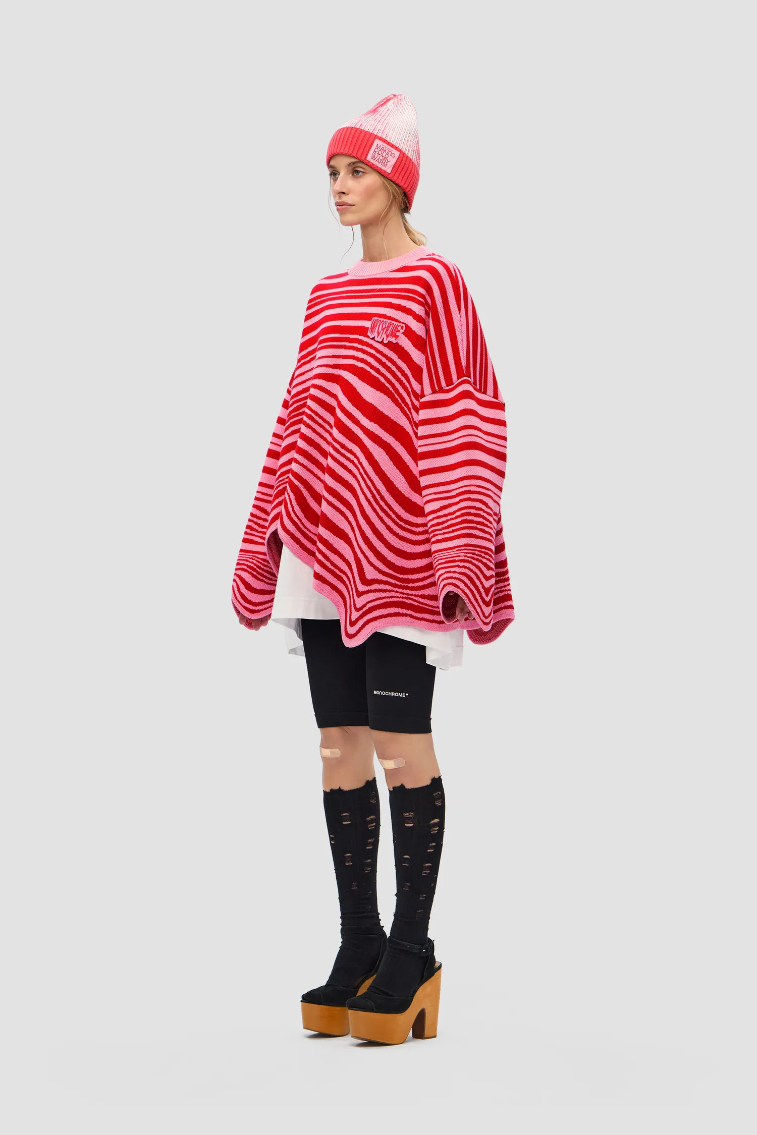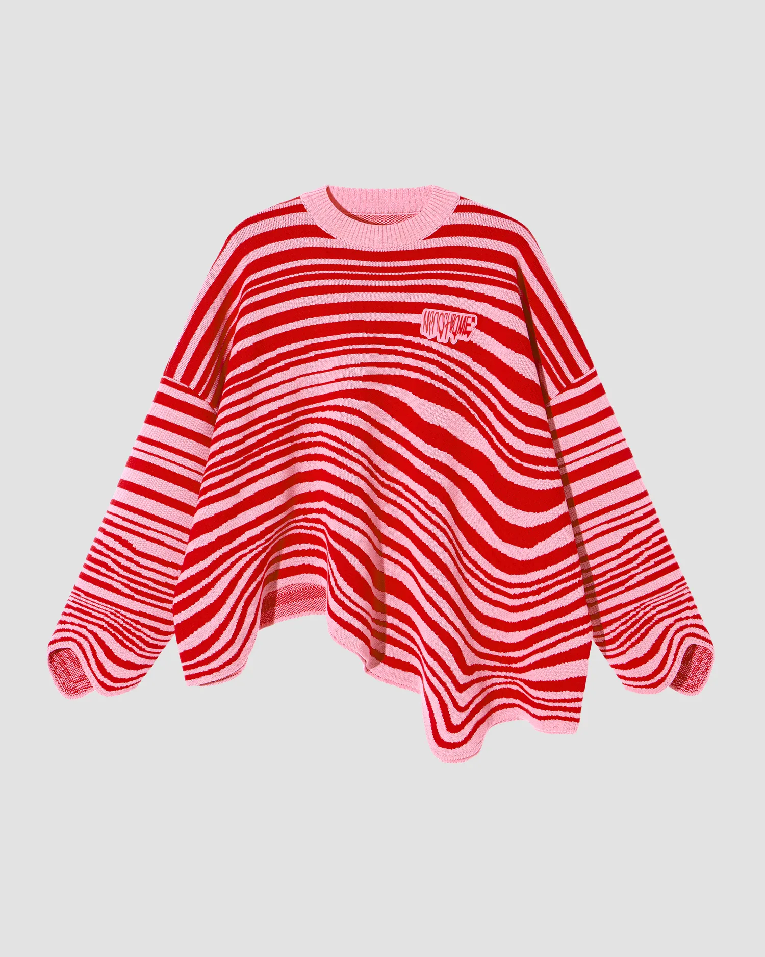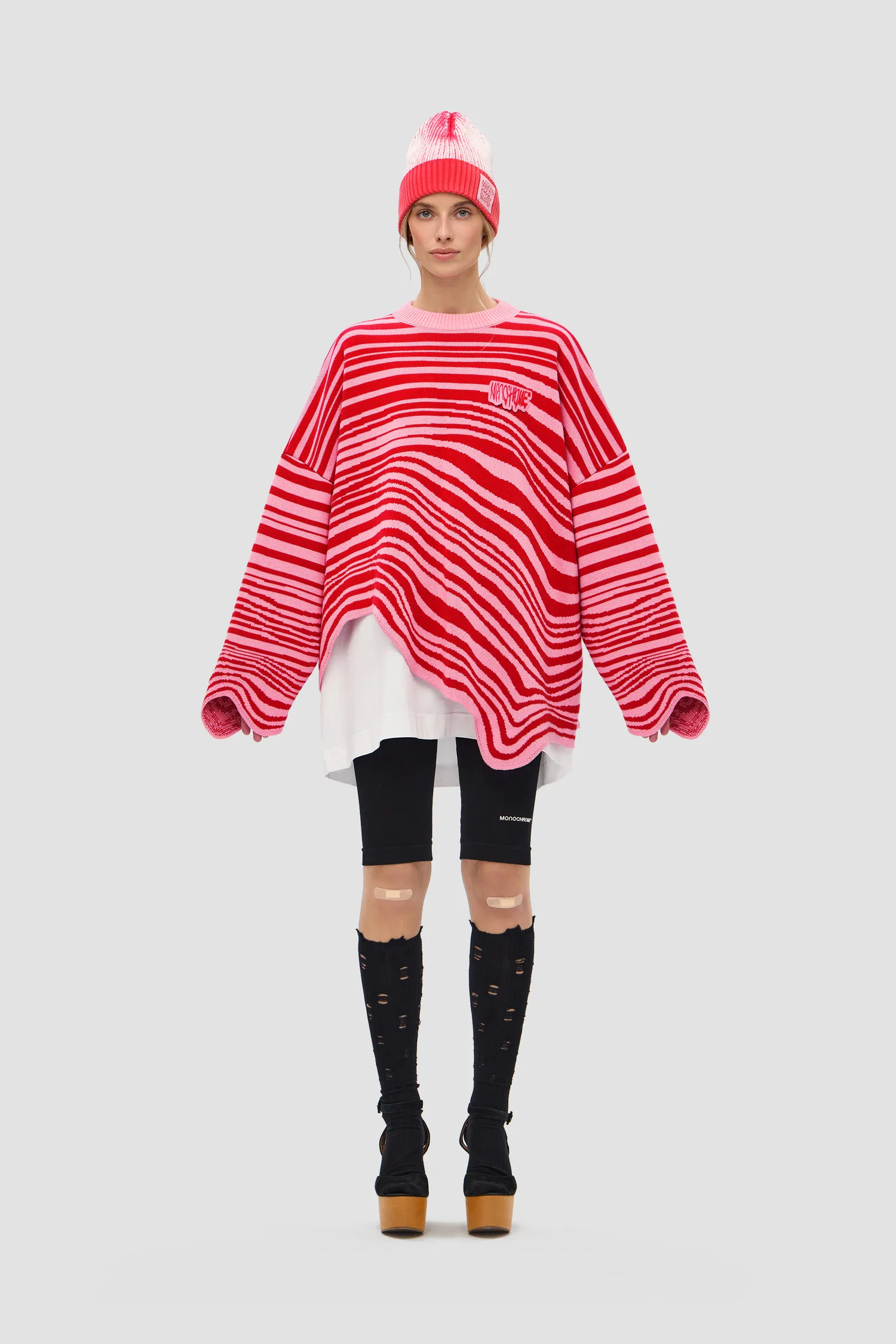 Свитер с ассиметричными линиями и волнообразным силуэтом красного цвета. Смесовый хлопок. Полимерная нашивка в области груди. Гладкая фактура. О-образная горловина. Onesize&Unisex. Упаковка в подарочную коробку.