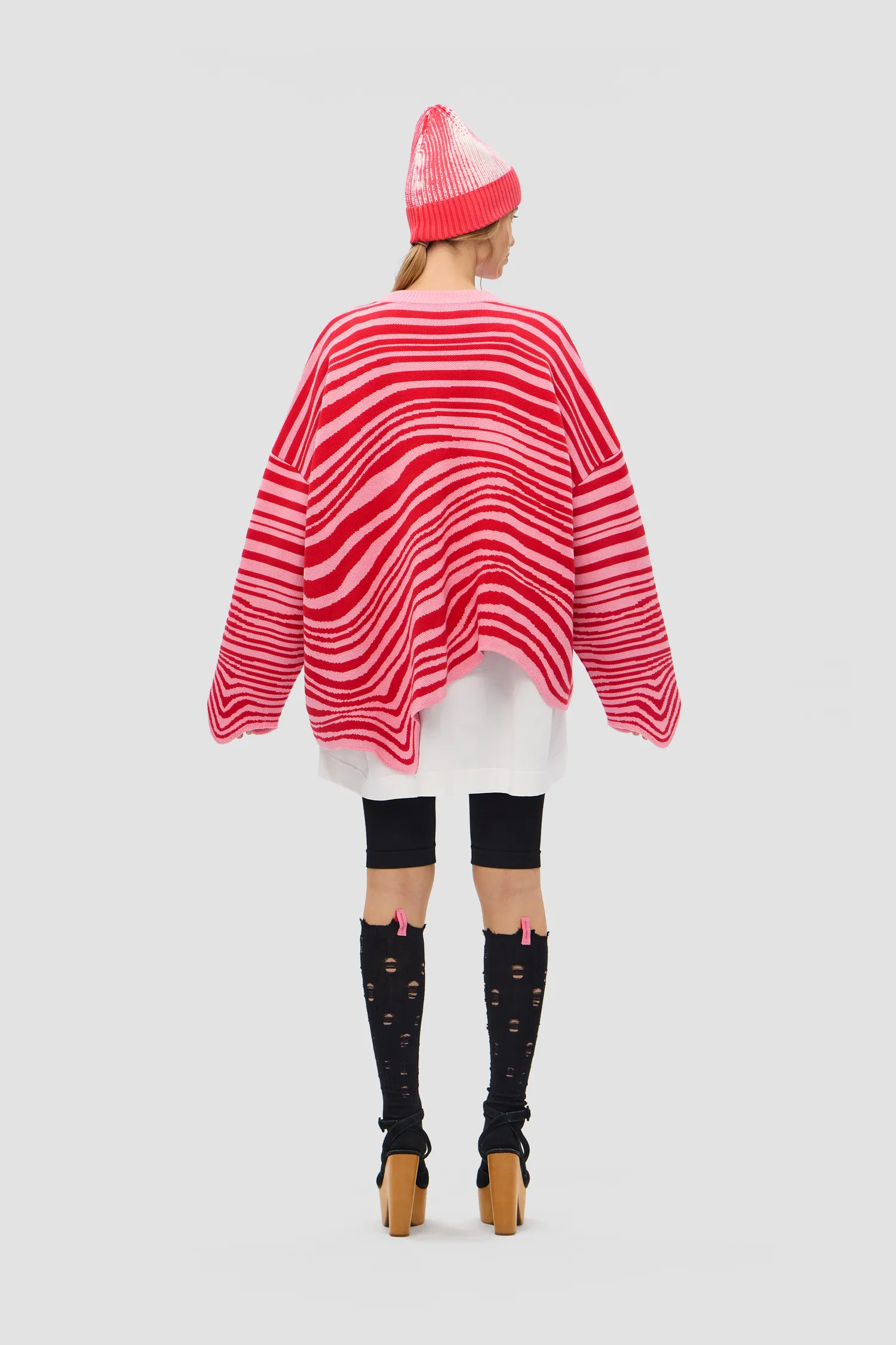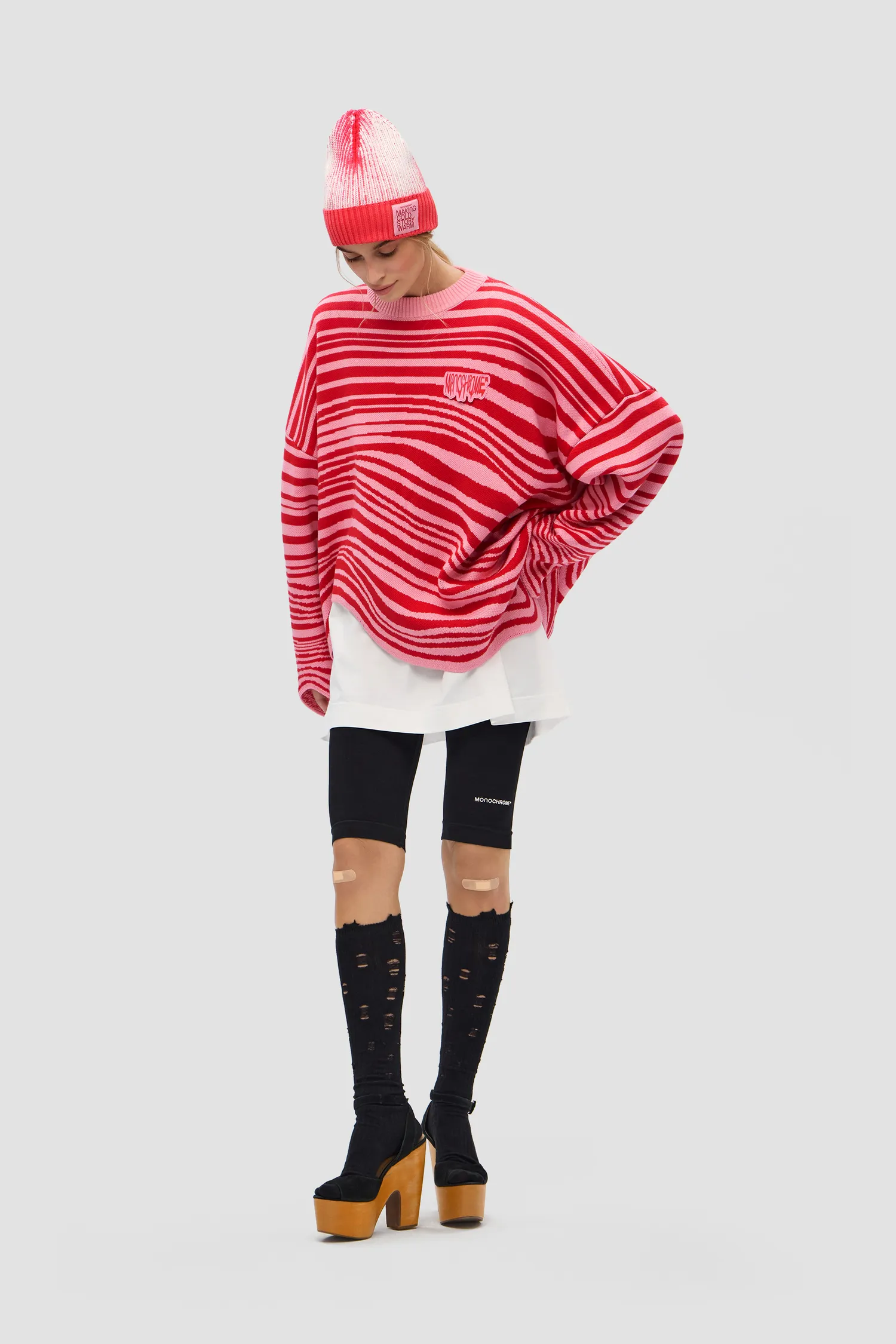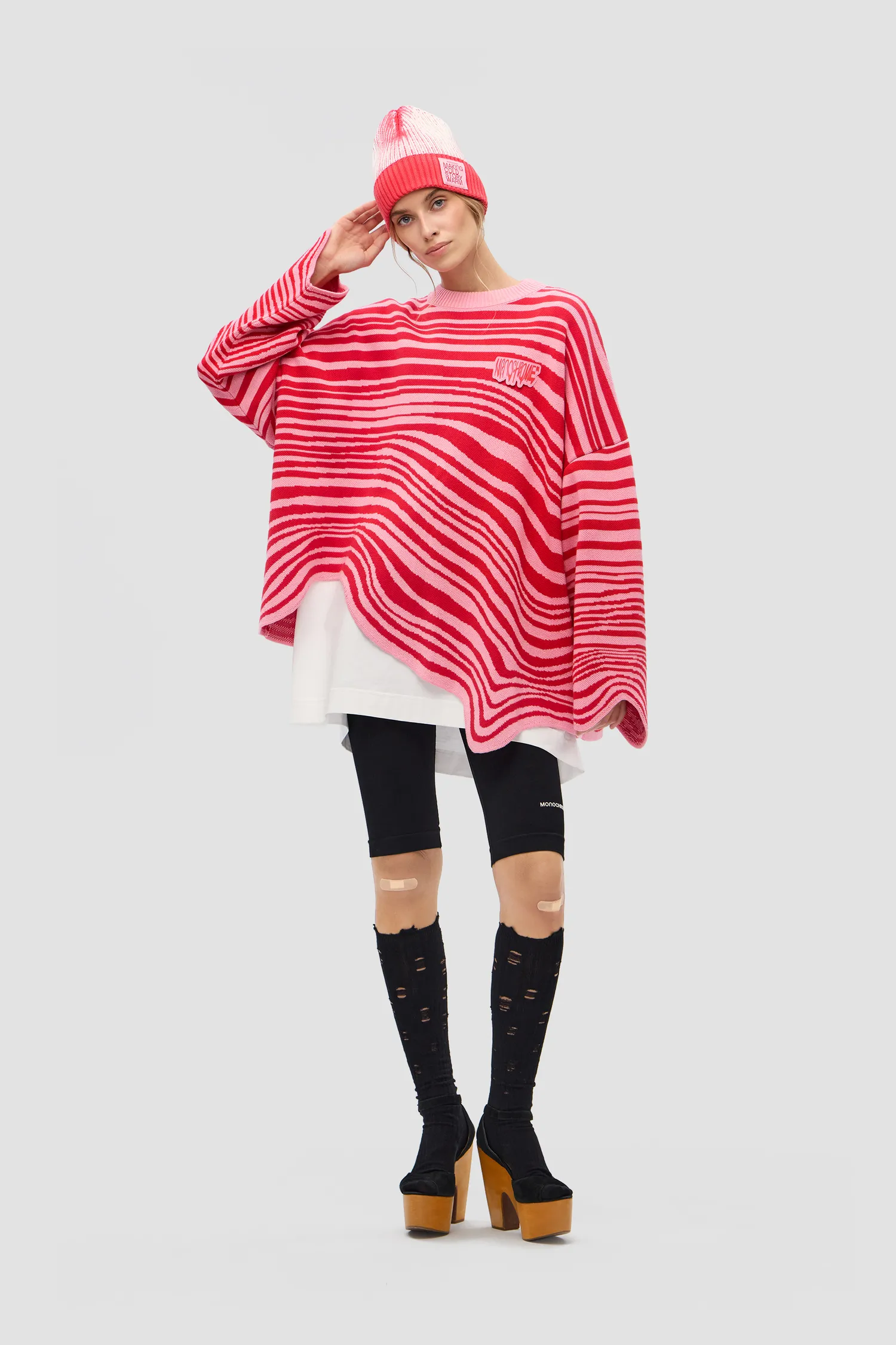 Свитер с ассиметричными линиями и волнообразным силуэтом красного цвета. Смесовый хлопок. Полимерная нашивка в области груди. Гладкая фактура. О-образная горловина. Onesize&Unisex. Упаковка в подарочную коробку.